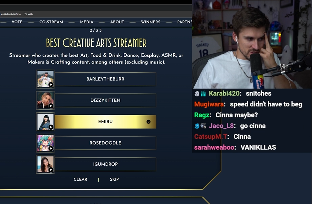 >>942667090He voted for EE first and gave a speech. Then he came back and switched EE to emi because he didn't want to pick Speed twice. So he put EE irl Speed soty Emi creative.