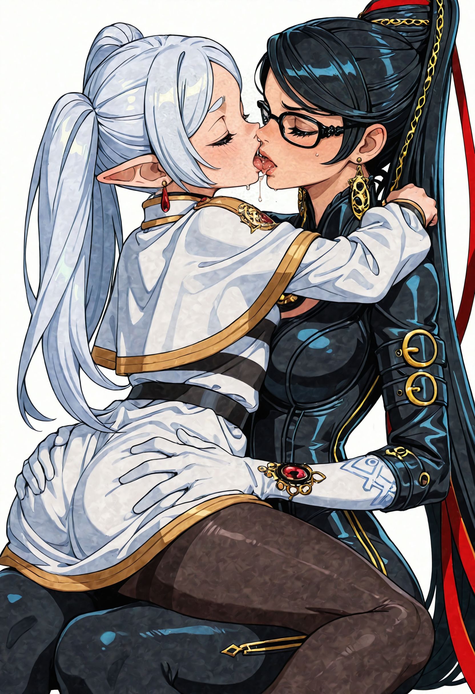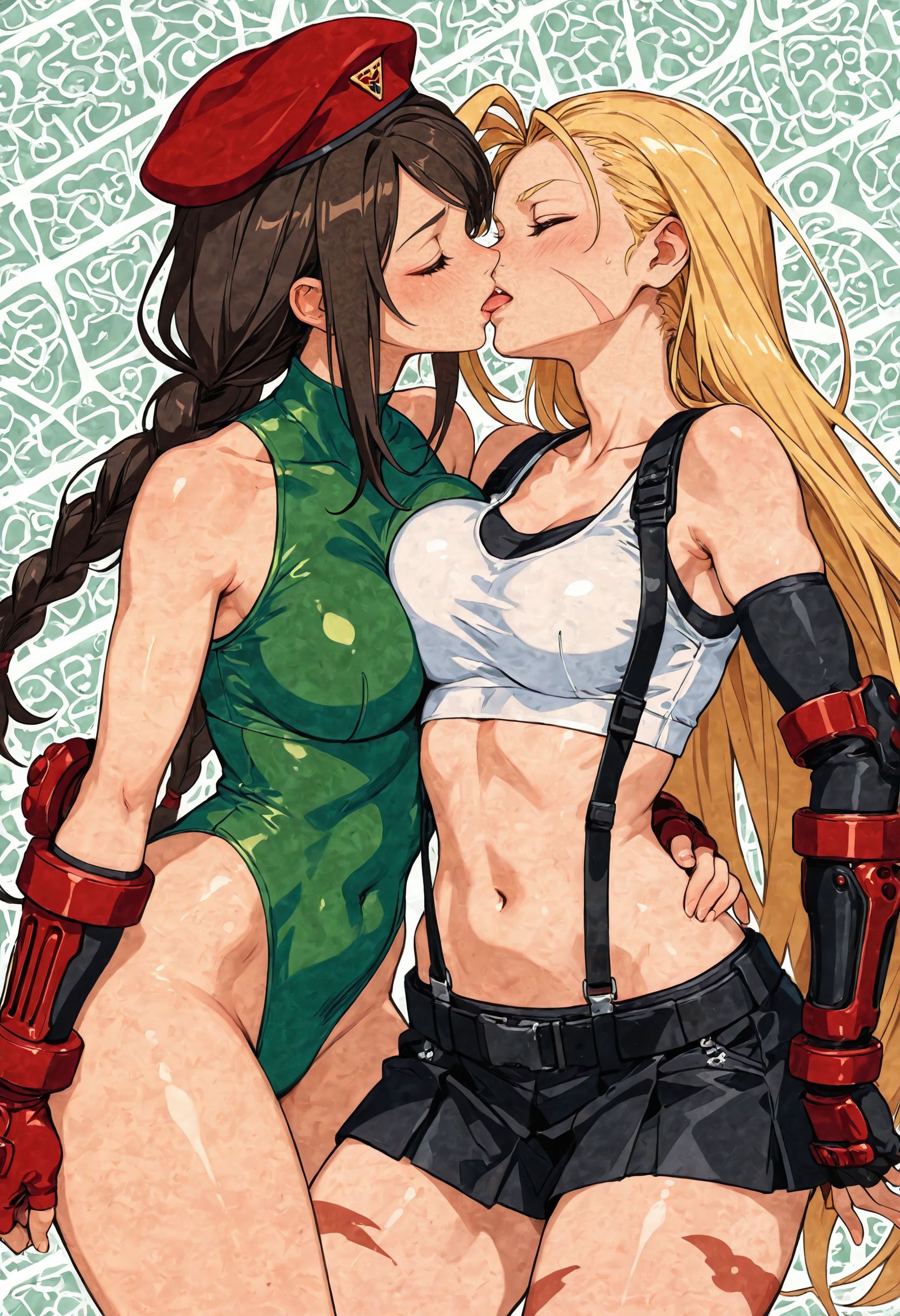 >>942706720kek>>942706752seconded.>>942706796cute!>>942706783used regional prompt2girls, white background,BREAK, 1girl, tifa lockhart, cammy white \(cosplay\), alternate costume, brown hair, braided twintails, green leotard, red beret, kiss, eyes closed, tongue,BREAK, 1girl, cammy white, tifa lockhart \(cosplay\), alternate costume, blonde, very long hair, white croptop, black skirt, suspenders, kiss, eyes closed, tongue