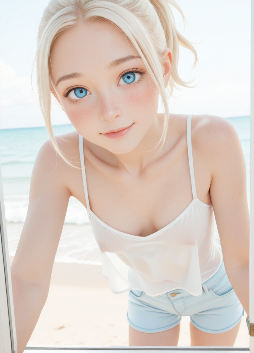 >>942800182>>942800127Even better without the rainbow! Can you make her skinnier with a flat chest and maybe both arms up? Double the pits;)Maybe even hard nips poking her wet shirt too but if sora doesn't let you all good :)