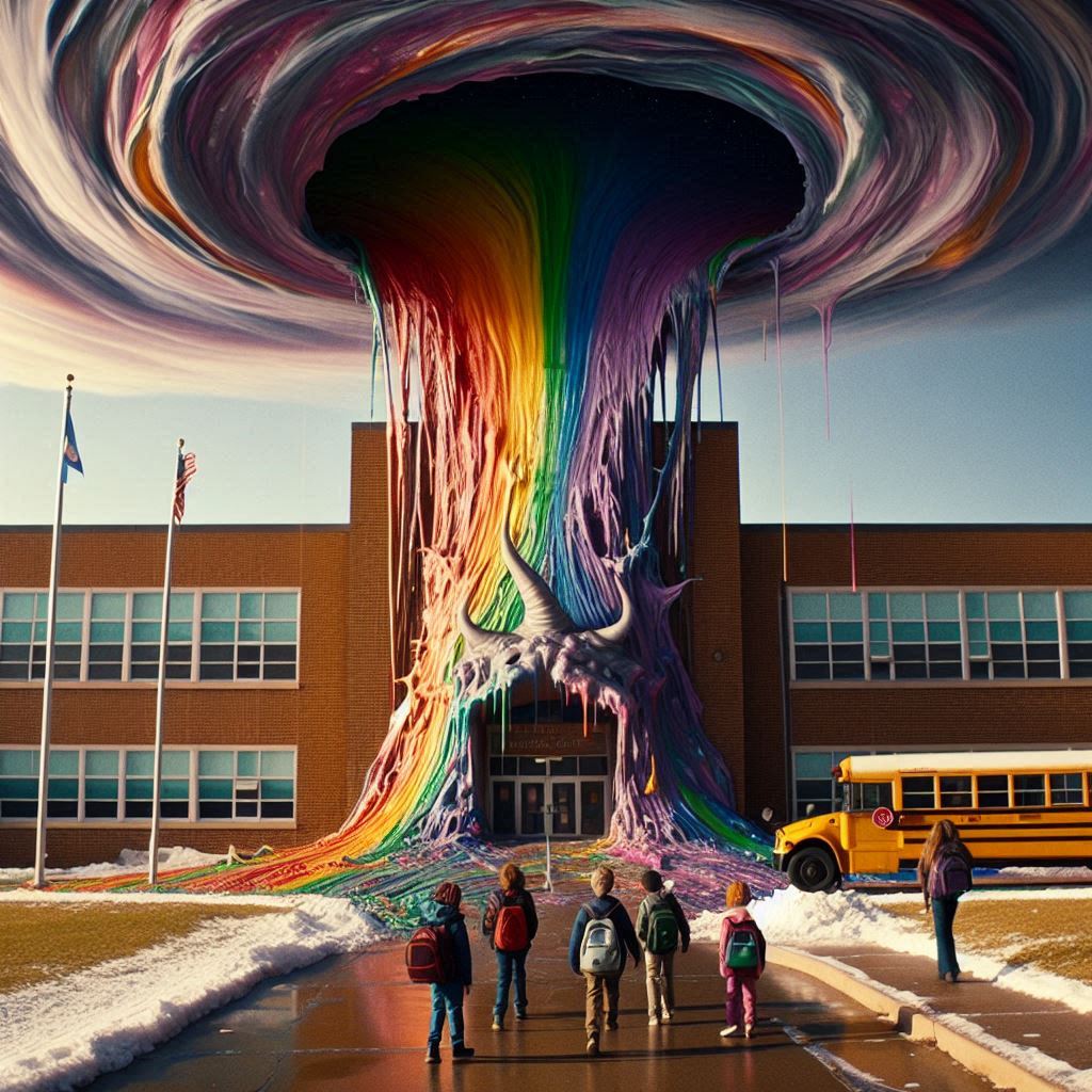 >>942840872OK so you're so brainrotted by politics that you can't even understand that AI slop images of "school with rainbow corrupting it" is not comedy, got it
