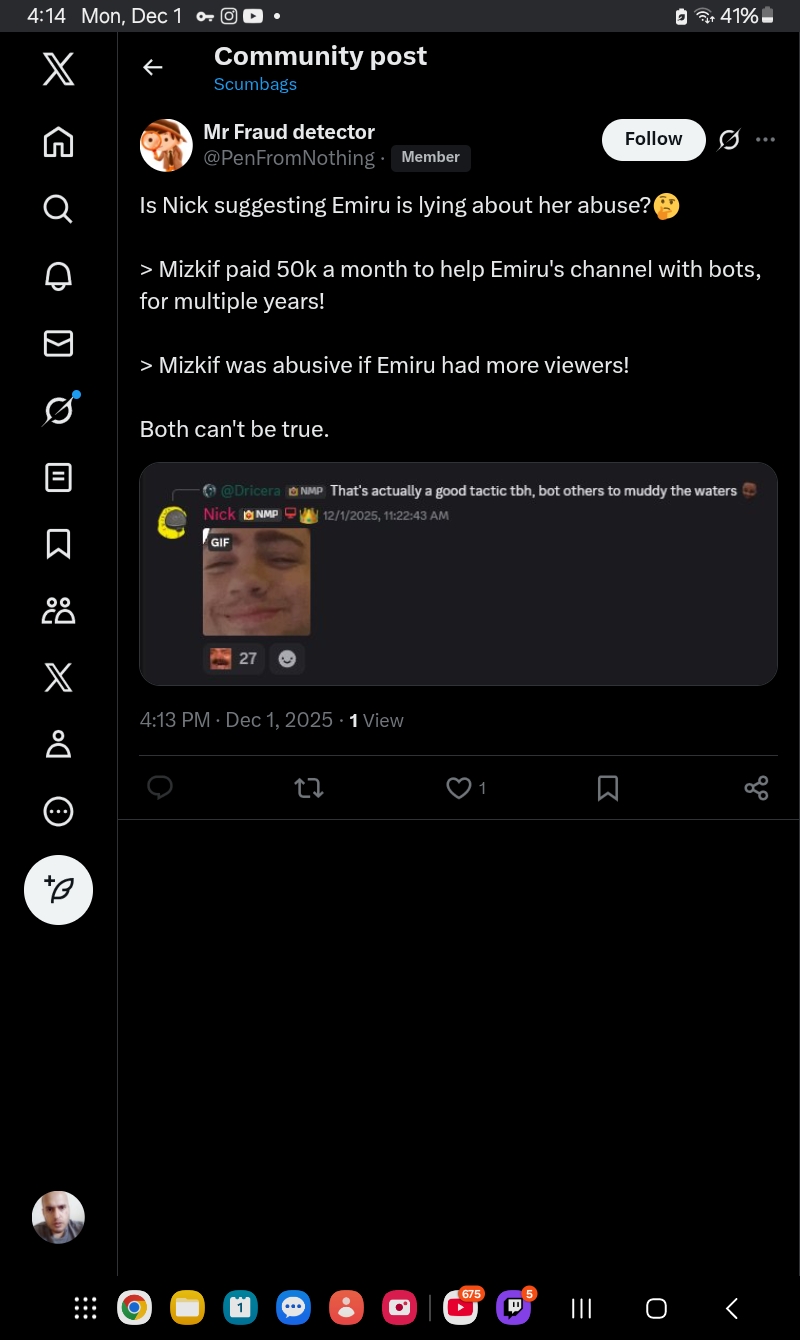 >>943175726Reminder that viewer metrics failed the Katchii test (a streamer that is both view and follower botting on multiple platforms). It cannot detect Nick's inhouse bots.Convenient that Nick got his best friend Sodapoppin to promote this account that won't detect his or Sodas bots, but will frame Emiru (and Cyr). This is after Sodapoppin already pulled up Emiru's stream to call her out for botting a couple of months before.Nick has been complaining about being unable to get blue chip sponsors since he made fun of drowning children and his girlfriend did the Nazi salute, while Emiru signed a Red Bull deal this year. He also had a crash out over Agent getting a Popeyes sponsor over his girlfriend earlier this year. He has been increasing the bots on his orbiters in preparation of his return to streaming and has now accused Emiru of botting again on his botted yt podcast, that gets views deleted regularly.