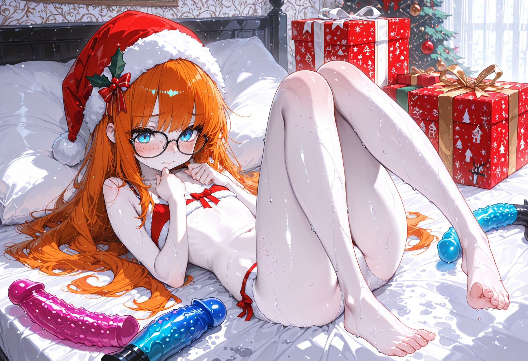 >>943198379>White cute pale skin girl with blue eyes, many many freckles, black thick glasses, orange long ginger fair hair.>Totally flat chest.>Very small pinky nips.>She is in her bedroom wearing just her red and white panties and a Christmas hat, feet visible, stand up, there is and opened Christmas gift box over her bed, and inside there are many dildos, and she has one of them in her hands and is embarrassed and horny looking at it.>Would be amazing if their panties are a bit wet.I wanted to see what would happen if I dropped this as-is into Forge.