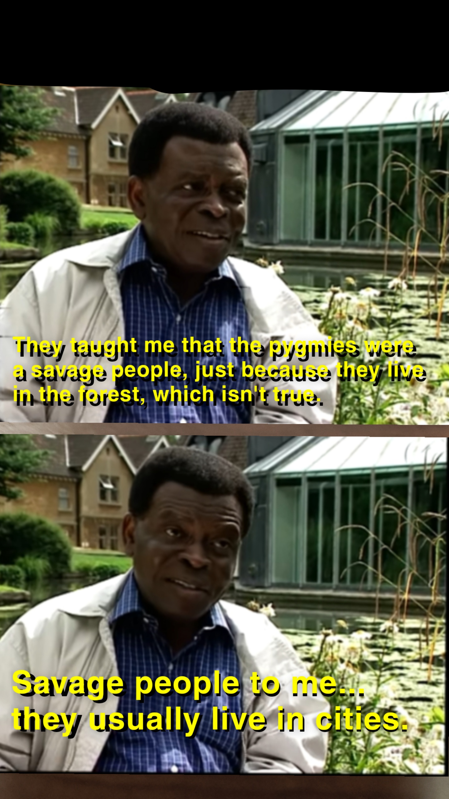They taught me that the pygmies were a savage people, just because they live in the forest, which isn't true.Savage people to me... they usually live in cities.