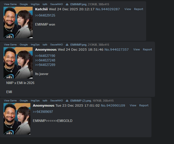 >>944031209>>944031225>>944031228This ship started in summer 2024 when Nick and Emi were playing league together and doing irl streams together.But the ship died after the shipping Arc and now some hardcore EMINMP ship riders are trying to revive it in 2026