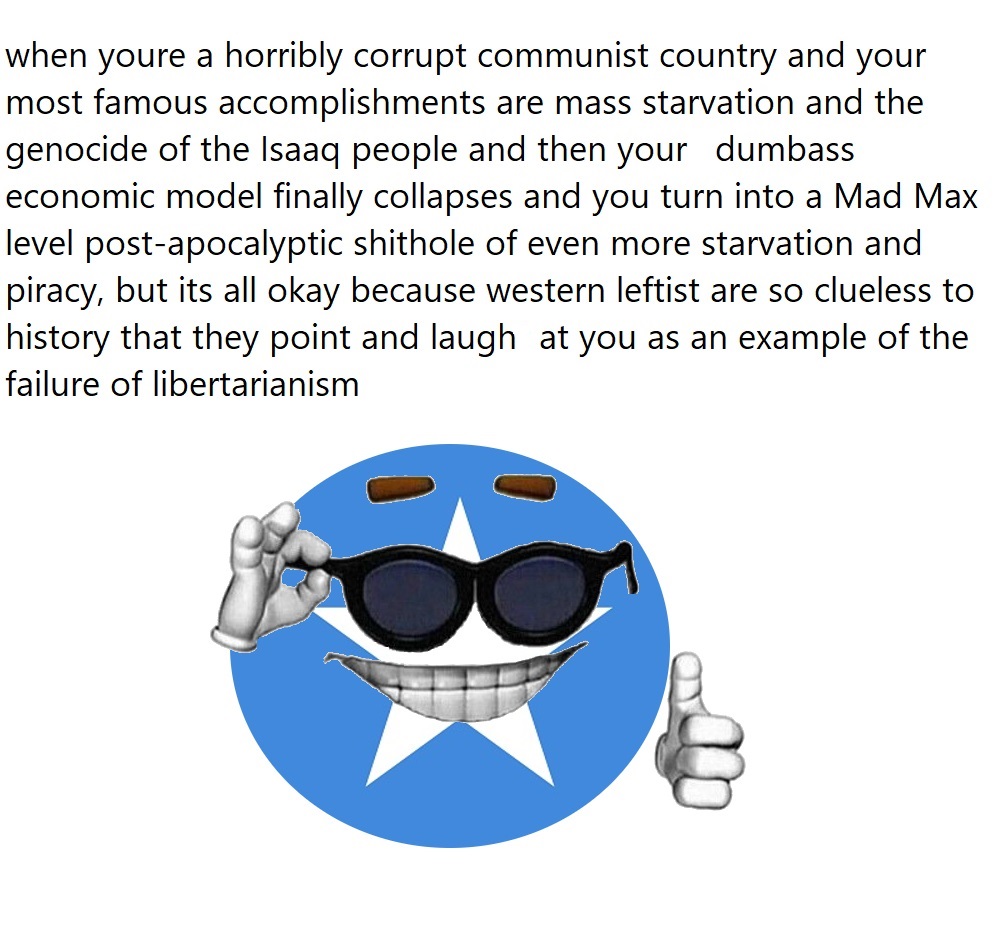Its pretty funny seeing just how contrarian people get with politics. Conservatives say Somalia is a shit hole country (objective truth) and liberals have to come out in droves and pretend it isnt. Utterly unserious buffoonish behavior.
