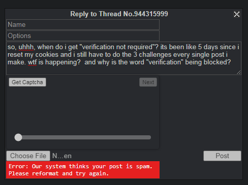 so, uhhh, when do i get "veriÆ’ication not required"? its been like 5 days since i reset my cookies and i still have to do the 3 challenges every single post i make. wtf is happening? and why is the word "veriÆ’ication" being blocked?