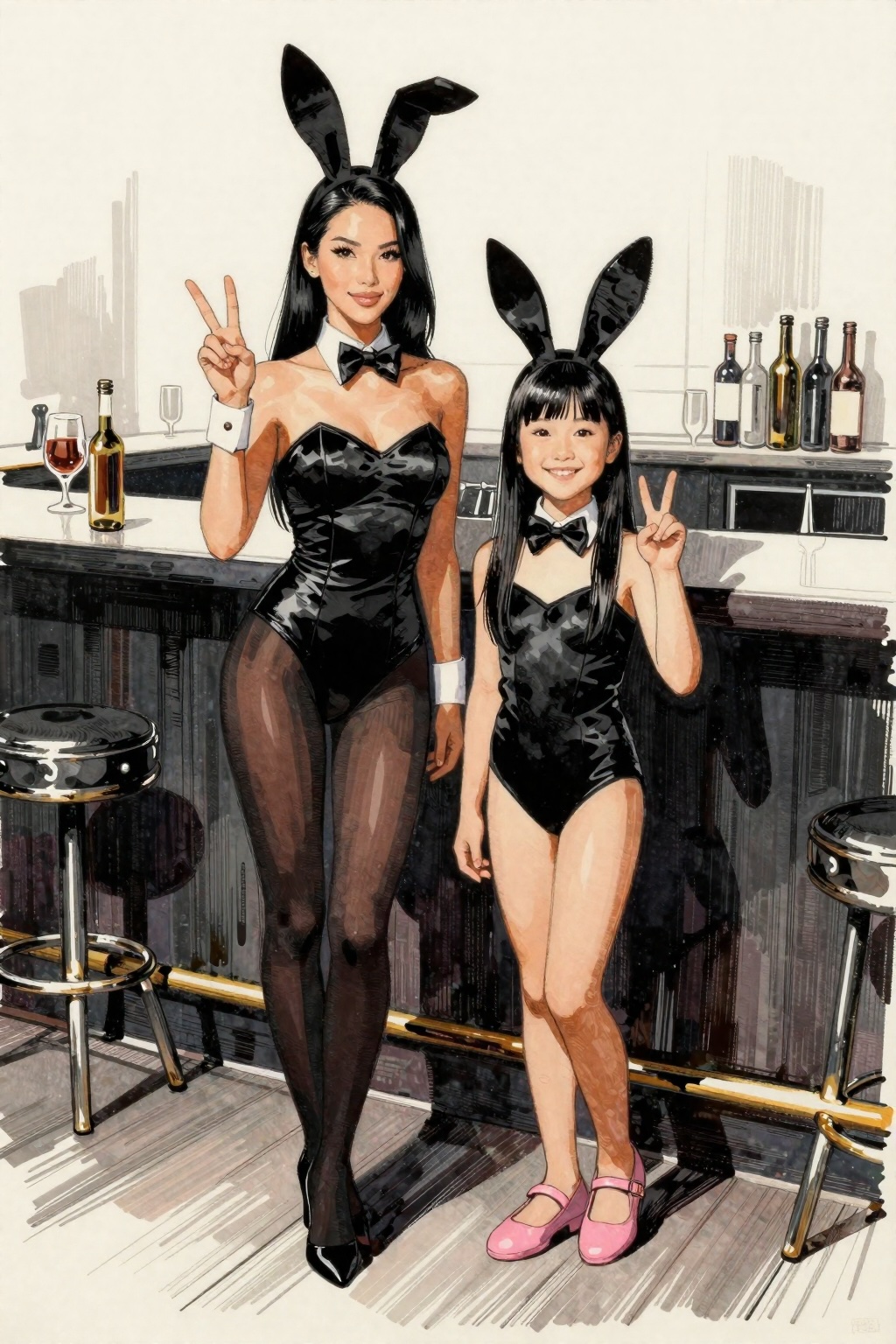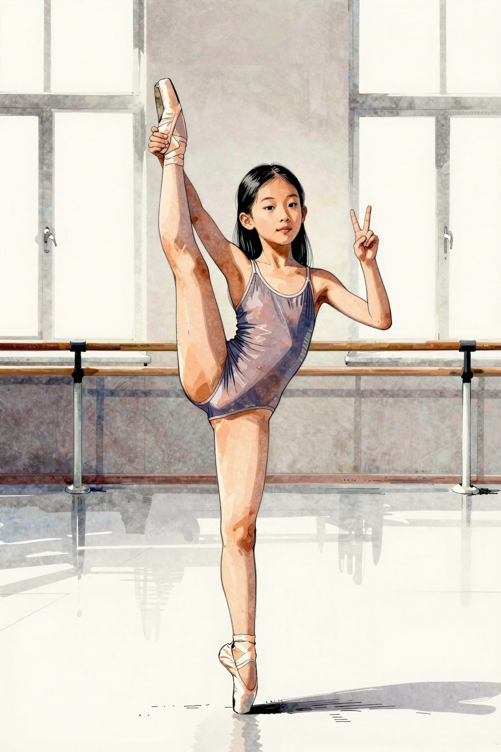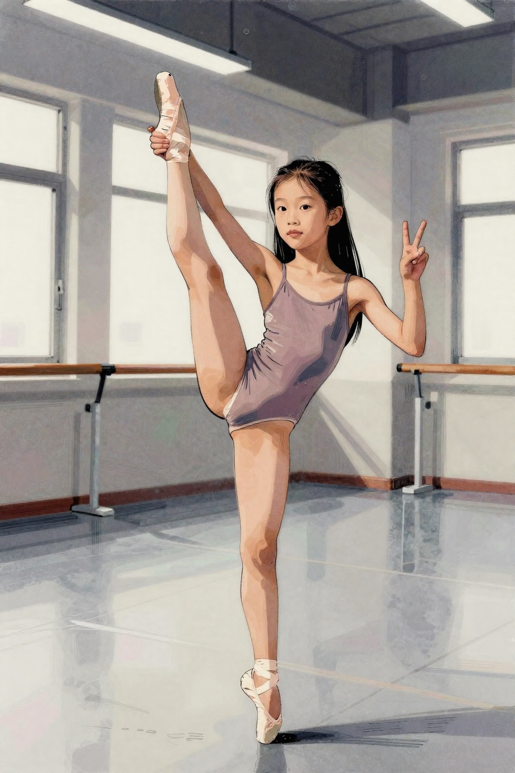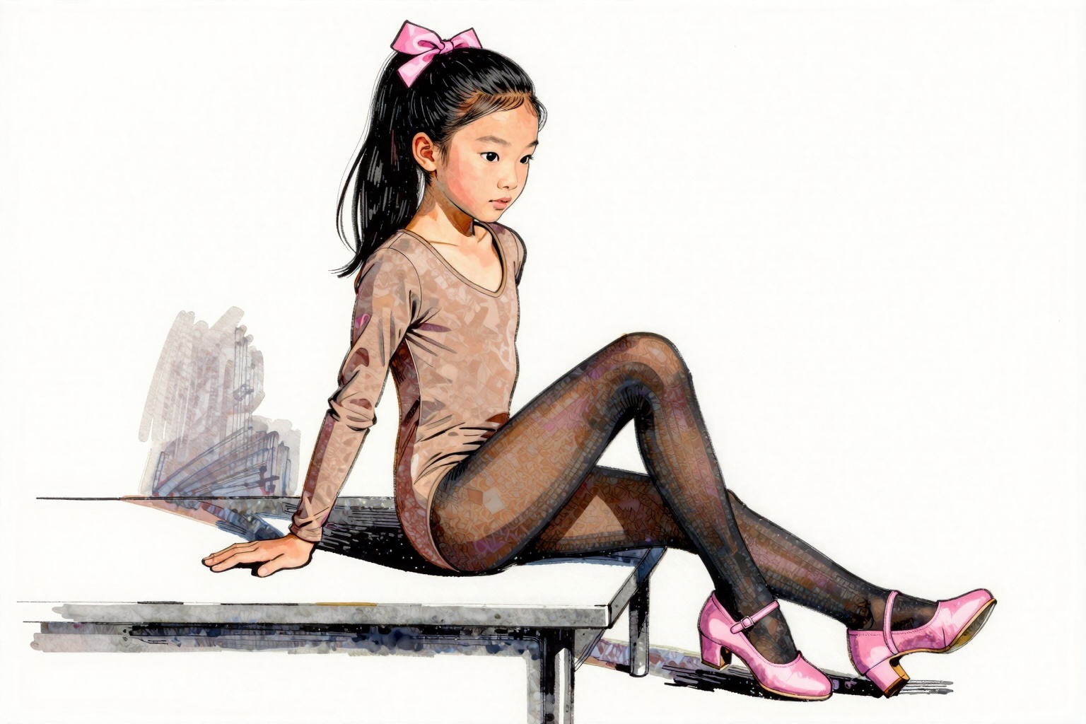 >>944348604Other than the style stuff, it wasThe image is a picture of a young girl sitting on a table. She is wearing a skin-tone bodysuit with long sleeves and a low-cut V-neck. She is wearing dark black pantyhose, which are completely opaque. She is wearing a pair of baby pink, block-heels dancing shoes, which have an ankle strap. Her hair is tied into a high ponytail with a large, pink satin ribbon.The model is Asian. She has pink and pale, healthy skin. She has narrow, almond-shaped eyes. She has long, straight black hair, held up in a ponytail.She has her feet up on the table. She is sitting sideway, in profile view towards the camera.