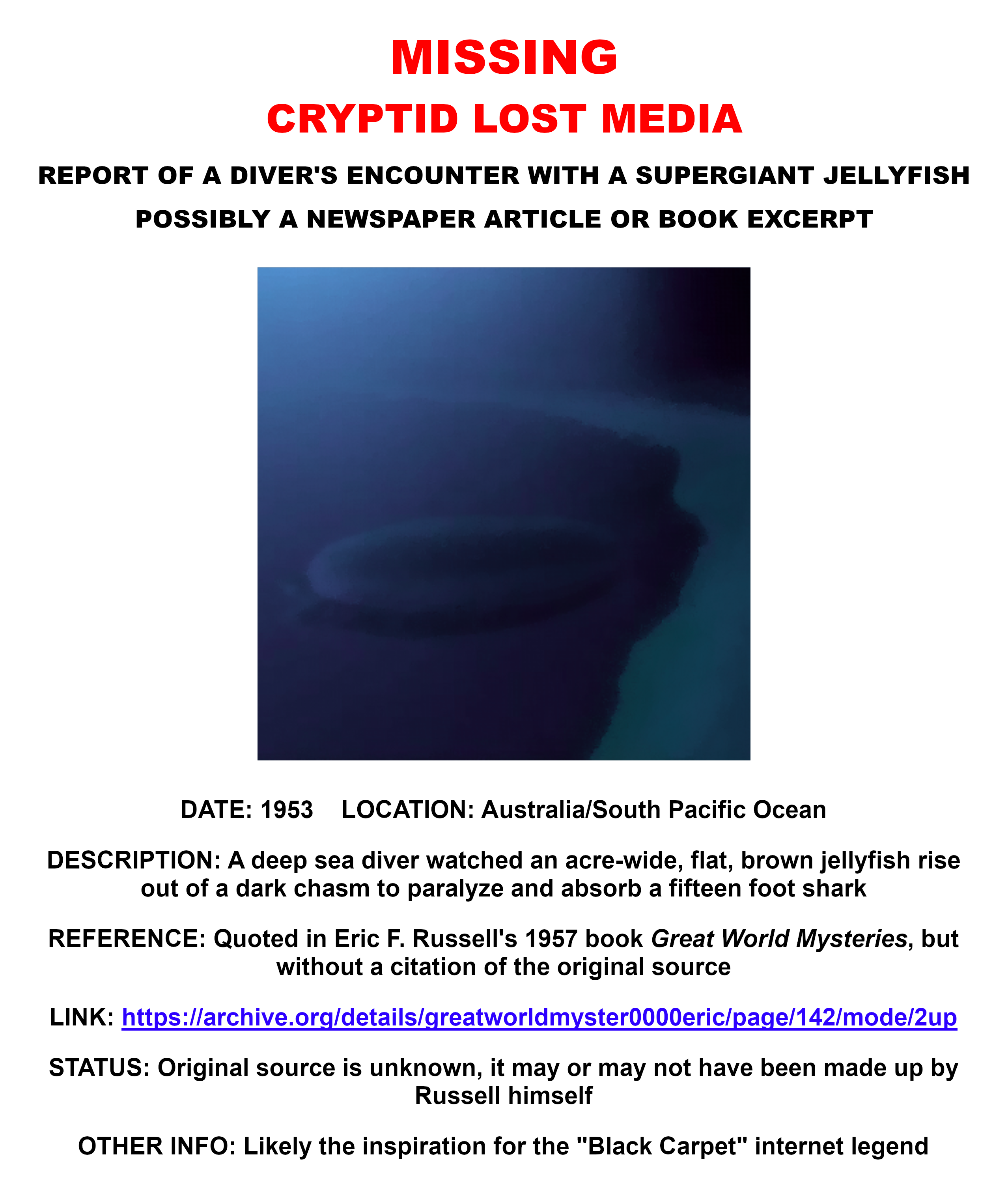 >>944750241I wish but if you just google "black carpet cryptid" you can pull up some fun reads