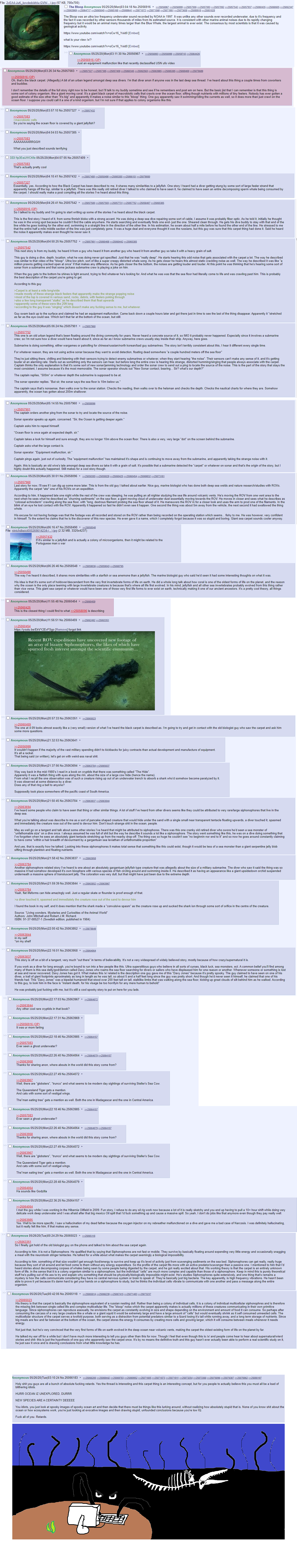 >>944750600I read it once on /x/. Though what you posted it a thumbnail I recognise it. It's about Salps and that guy Anon knew who worked with sonar iirc. Cool bread. We used to have threads about the deep sea regularly on /x/. You know what? I think I might start one right now...