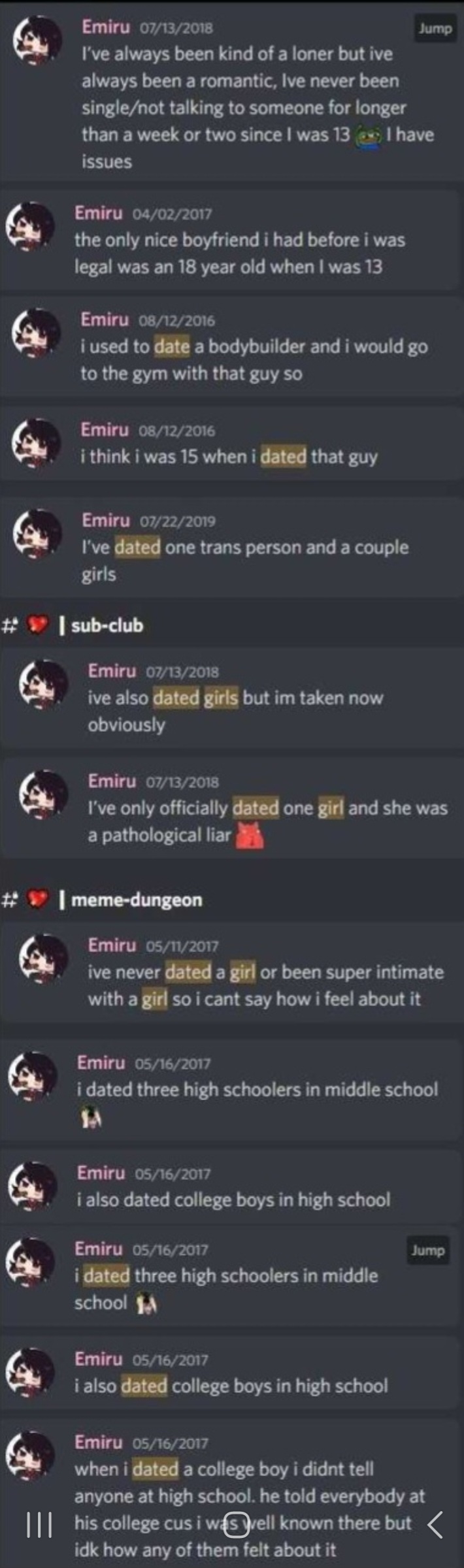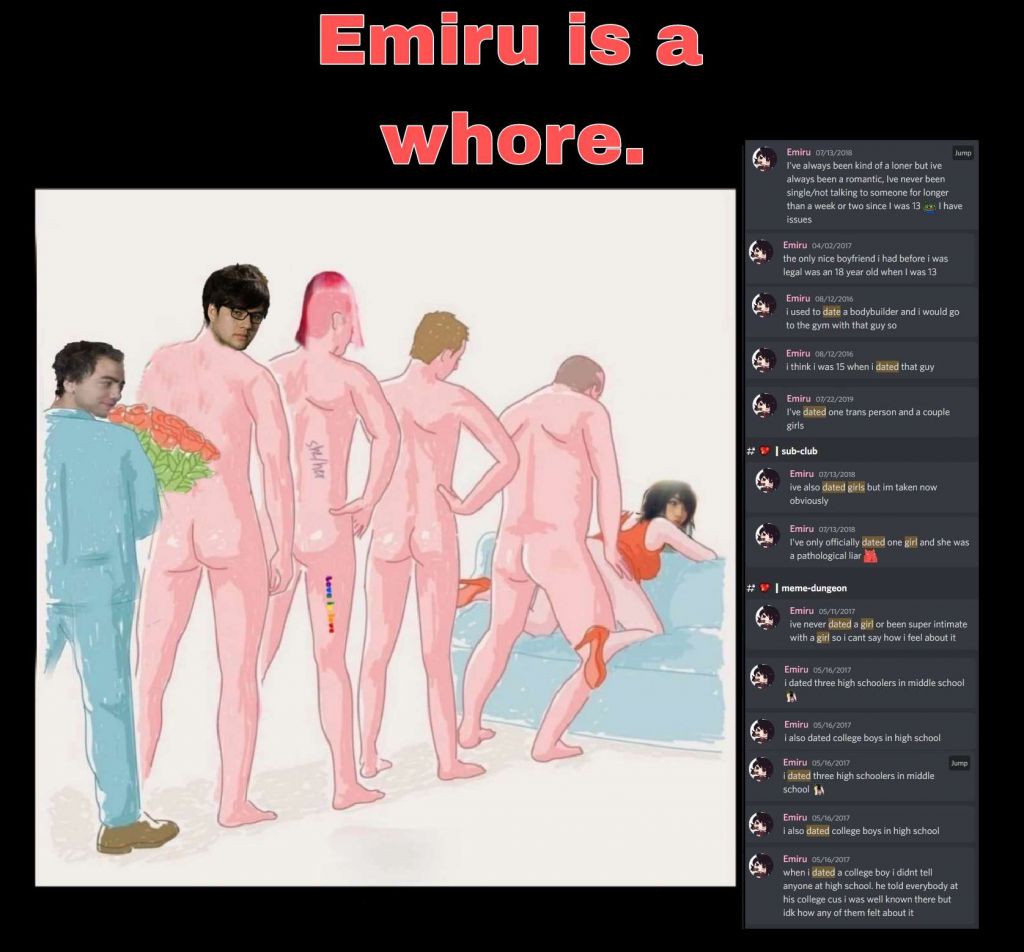>>944762282she has done it her whole life. she voluntarily told a story about how two of her guys friends gfs accused them of cheating on them with emi because of just their discord messages and calls. she really does just try to sleep with everyone. hole lac pulls it off if he hasn’t already.