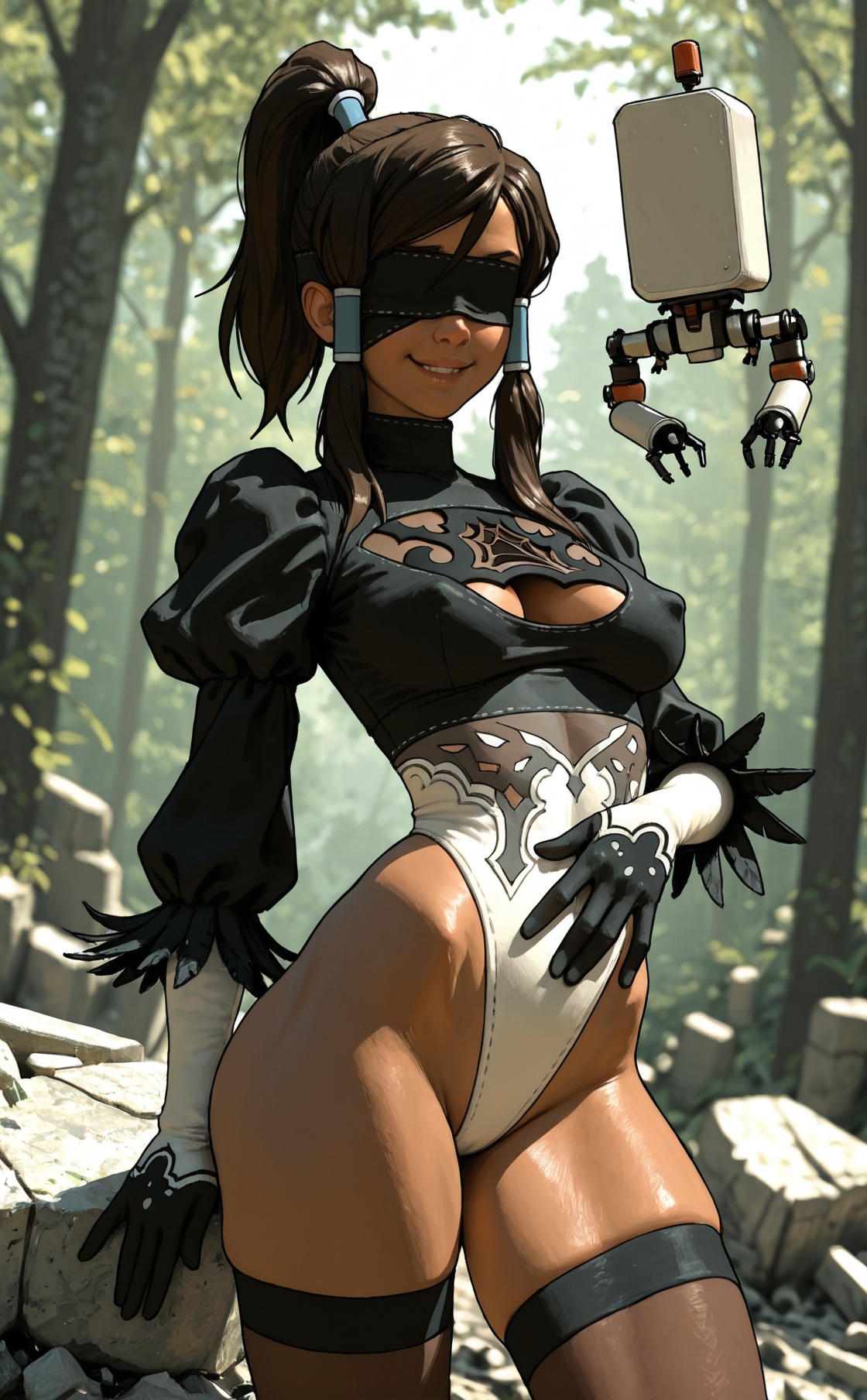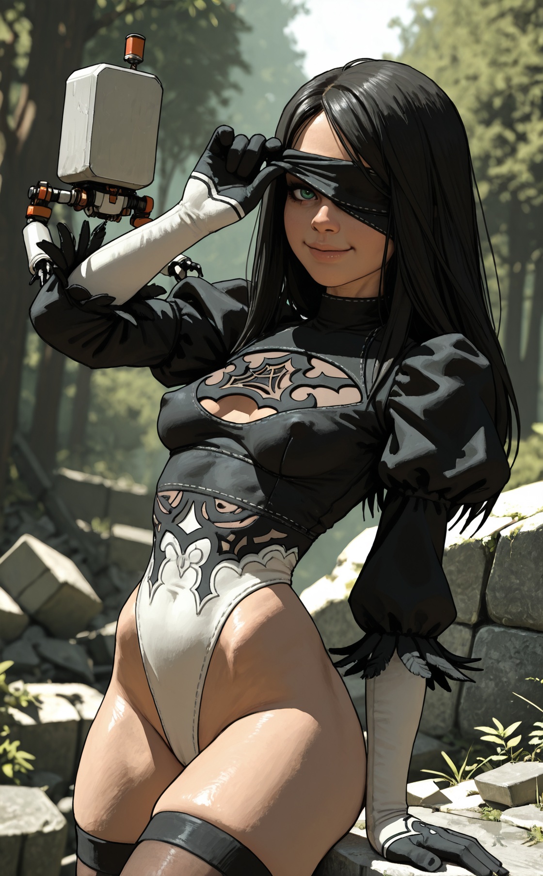 best quality,amazing quality,, forest,realistic,3d,(namespace:0.8),(pantsu-ripper), covered nipples, solo, depth of field, 1 girl, cammy white, street fighter, 1girl, blonde hair, long hair, antenna hair, twin braids, scar, sleeveless, medium breasts, thighs, 2b_(nier:automata)_(cosplay) , (toned:0.7), highleg,(skinny:0.8), ,, blindfold, {contrapposto, erotic pose|pinup pose|victory pose|hand on own stomach, contrapposto|blindfold lift, blue eyes|adjusting leotard, blush|fighting stance, dynamic pose}, {from behind, rear view, facing away, {anus peek|ass}|side view, from side| dynamic angle}, candid, dynamic angle, {parted lips|seductive smile|coy smile|smug smile}, stone ruins in background, BREAK, pod \(nier:automata\), nier:automata,