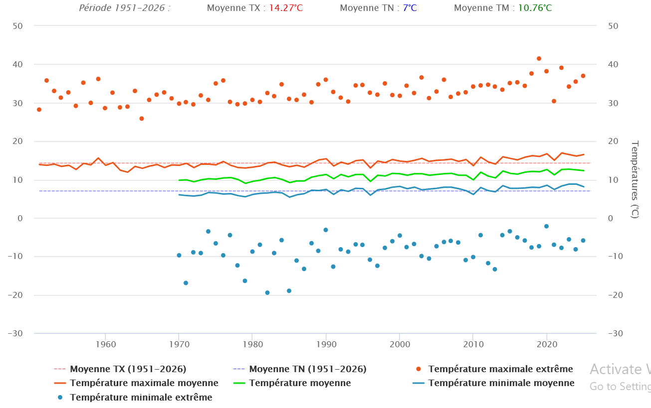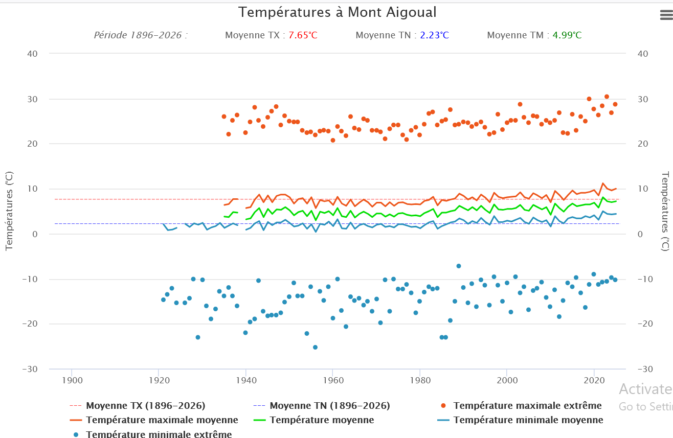 >>944854704As for your theory of the city building up, here is the data for the Mont Aigoual station. It's an isolated station on the windiest mountaintop in France. I trek around there on occasion. Very inhospitable. Google will show you how much urbanization there's been around it.