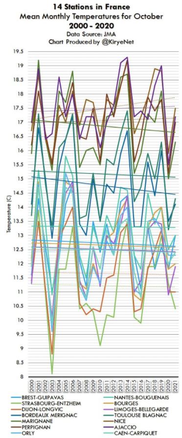 >>944855199>each individual station's sensors are publicly available at all times in real timeCan you give me a link to this? I would love t see this. It's rather rare. If what you're saying is true, then it may be that you have a realizable weather reporting system. I was skeptical because most of the others add in modeled data before it gets reported. NOAA was caught a few years ago changing the day's temps overnight for New York, so at 11:00 it would say a high of 82°F or whatever, but then the next morning it would say 88°. It's very difficult to find trustworthy agencies.>So yeah, maybe France is getting hotter, somehowI don't know, because I see Kirye created a France chart using JMA and almost every area is cooler since 2000. The globe is also /slightly/ warming because we're still trying to come out of this ice age.>Maybe global climate is a mystery that is destined to remain unknowableI think this is the statement of the century. Climate is a glowing example of a chaotic system. It doesn't matter if you you put a station on every square meter of available land, it only becomes more chaotic.>Maybe there's a worldwide conspiracy paid for by Big WindmillIt's massive control and trillions of dollars. In the US, the oil companies are pushing renewables. It's a massive business>denouncing the use of modelsThe noise doesn't matter, it's the clear departure from the measurements, smoothed or not, and the models that don't operate on reality. Even Gavin Schmidt says the models are running too hot. They NEED to fake it to crate scary graphs to say "hottest year evah". When was France's hottest year? Looks like is was 122°F in 1930.We would all be better informed if models were banned and we only saw the data, and if a station was reporting oddly, it gets removed, not corrected.