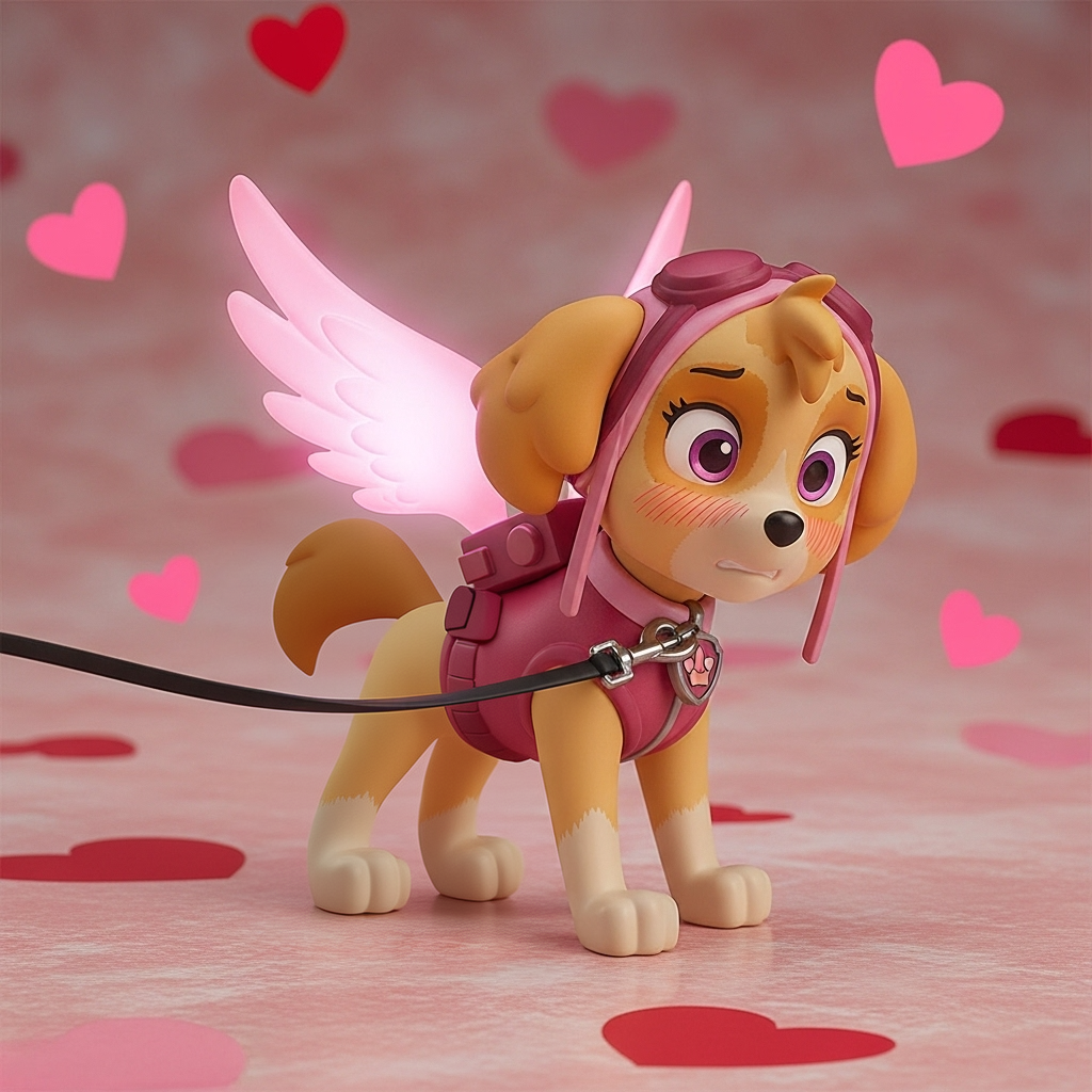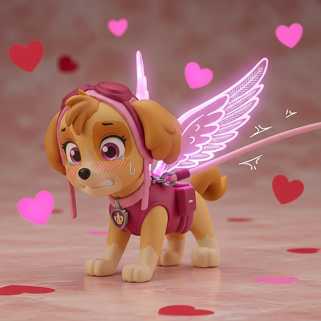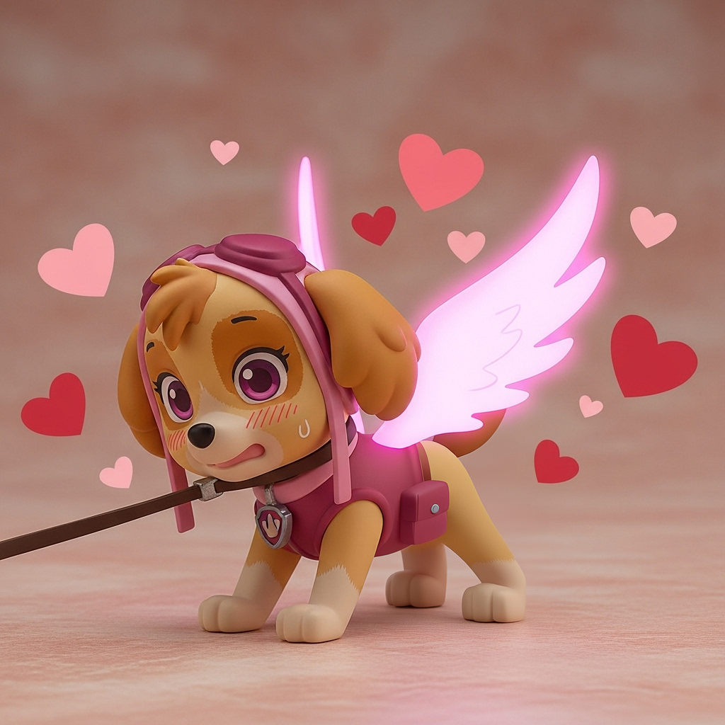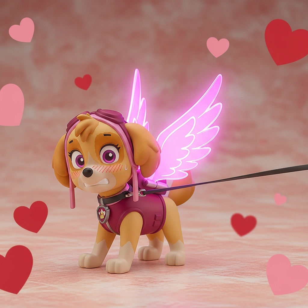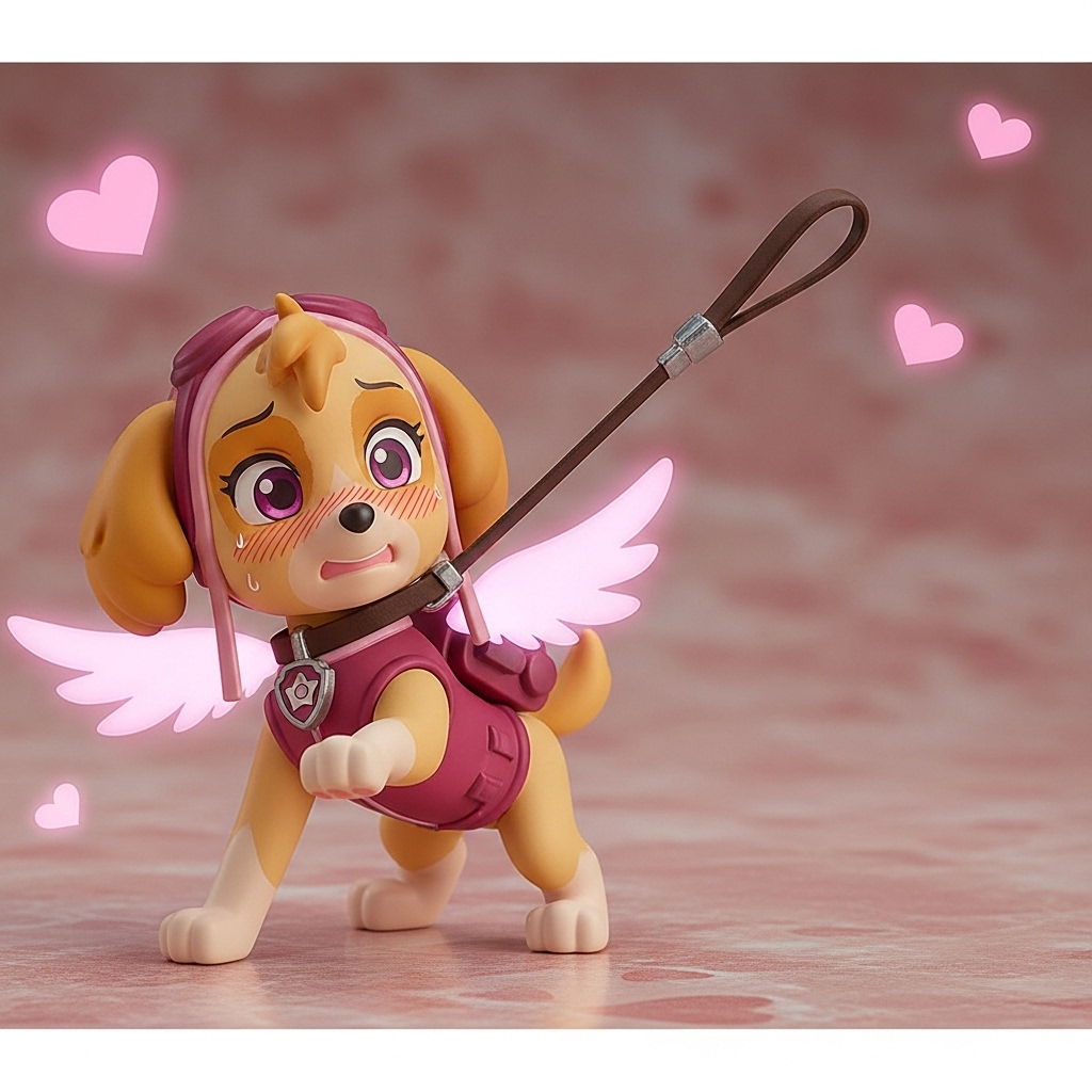 >>944869632I don't have a whole set ready to upload, I'm genning these as I go while sorting out some folders with other stuff in them. I used Google's ImageFX to gen her and this is the prompt little PVC anime figure of Skye from "Paw Patrol" on a leash around neck, blushing, blush lines, nervous, pink glowing wings, hearts background, on all fours, having her leash roughly pulled/yanked forcefully