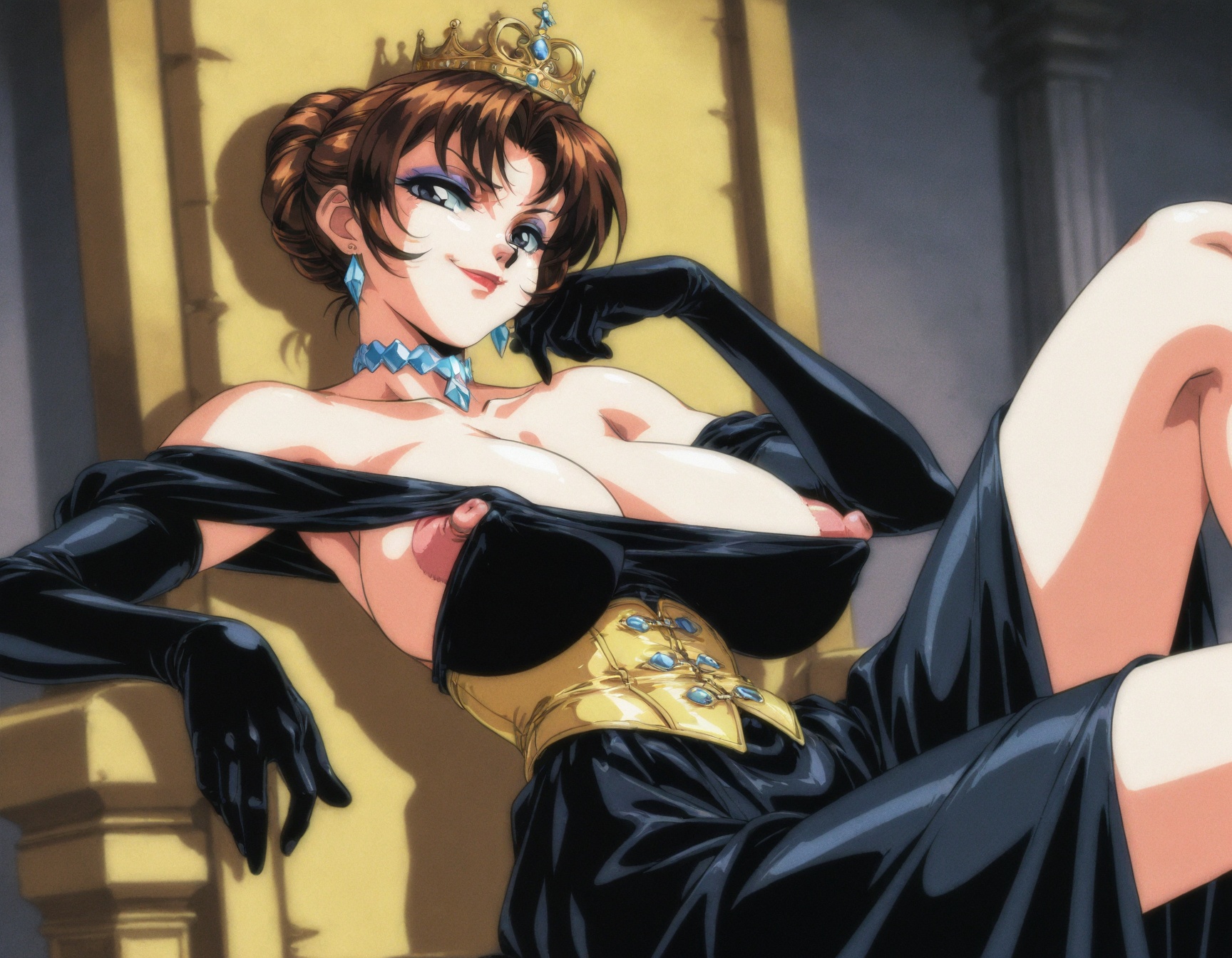 >>944895262#4 won that oneidk if this will help, but...>1girl, solo, an elderly queen sitting on a golden throne, huge natural breasts, large nipples, erect nipples, sagging breasts, (nip slip:1.1), off-shoulder victorian dress, corset, elbow gloves, crown, regal, smug, gray hair, updo hairstyle, diamond choker, diamond earrings, makeup, eyeliner, eyeshadow, lipstick, (cum on breasts:1.1)
