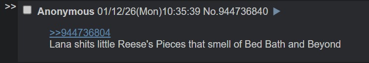 Fuck off logfag. We get it you wanna eat Lana's shit and drink her piss.