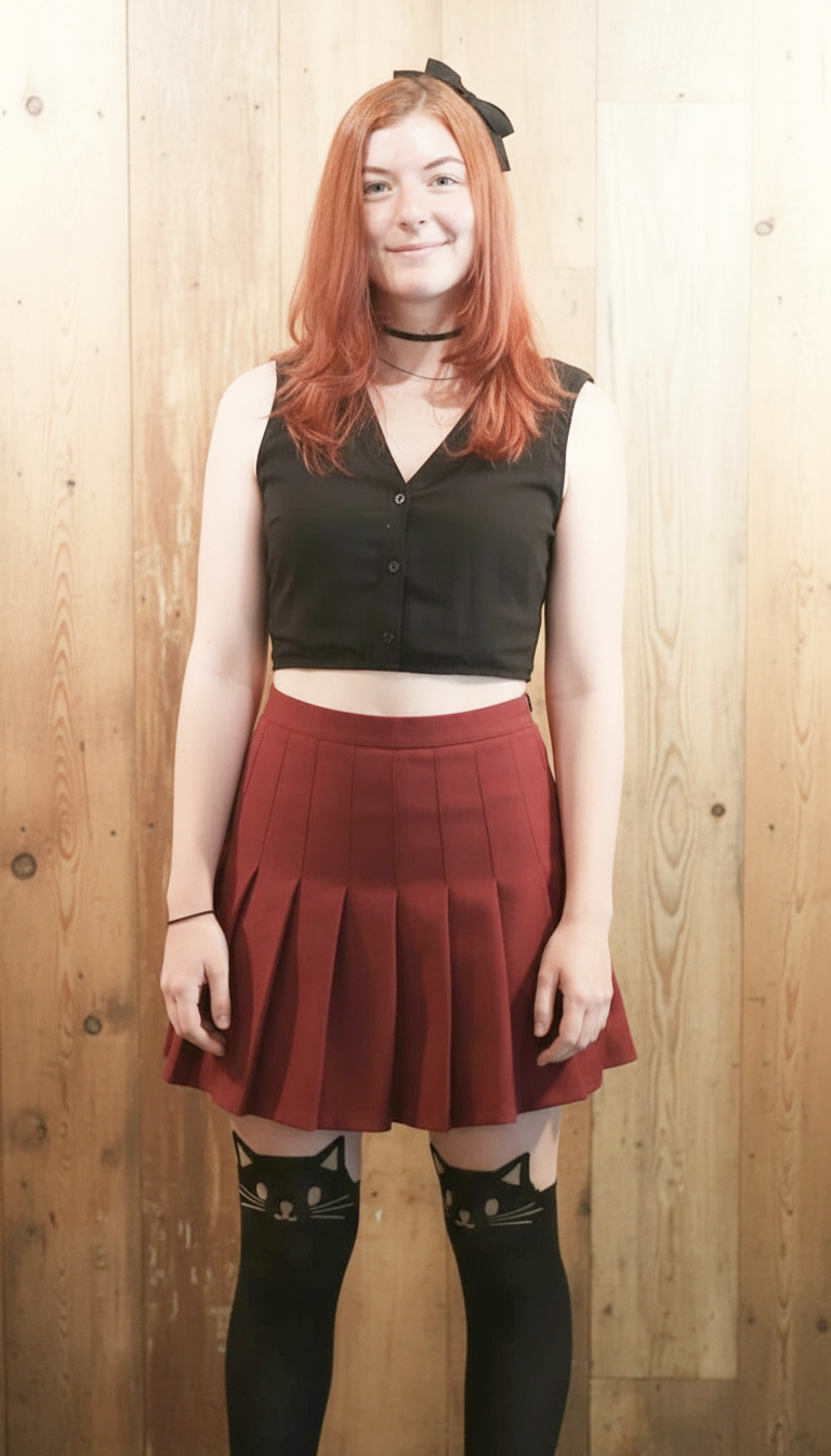 Pull top down to reveal A cups Open mouth, short stubby tongue waggle Load on face maybe, would be plenty satisfied with or without