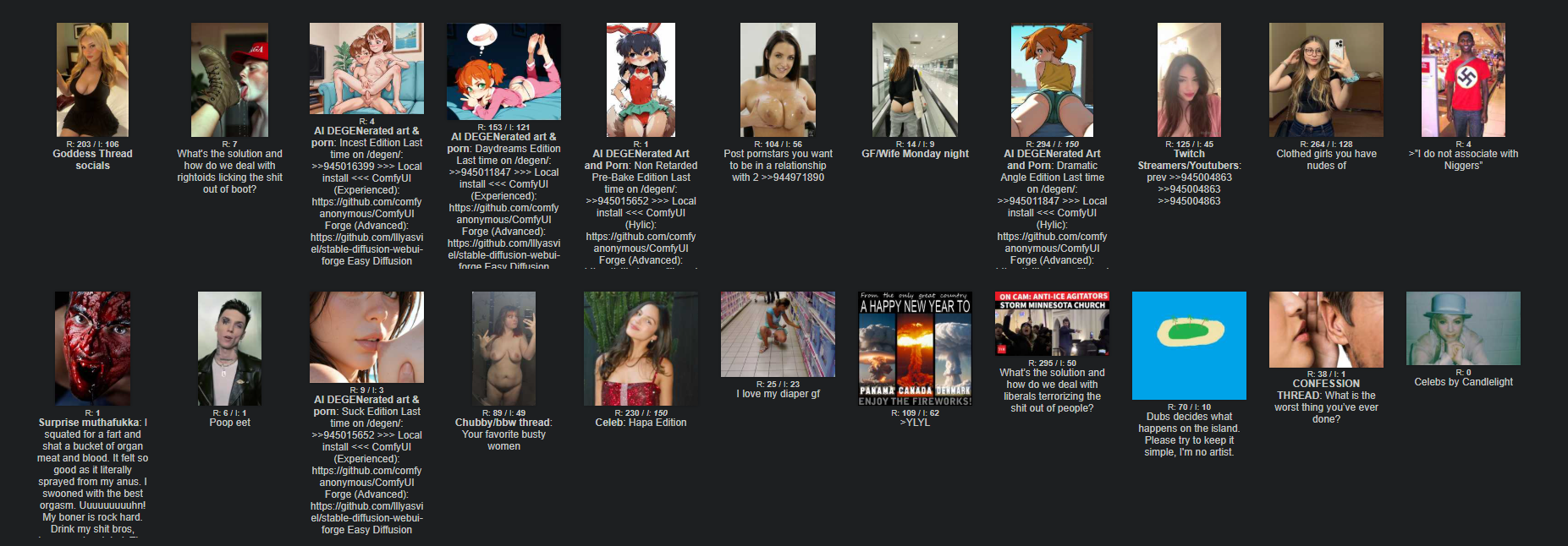 Non Retarded Pre-Bake EditionLast time on /degen/: >>945015652>>> Local install <<<ComfyUI (Hylic): https://github.com/comfyanonymous/ComfyUIForge (Advanced): https://github.com/lllyasviel/stable-diffusion-webui-forgeEasy Diffusion (Beginner): https://easydiffusion.github.io>>> Online Image Generators <<<Bing/Copilot: https://www.bing.com/images/createCivitai: https://civitai.comTensor: https://tensor.artPixai: https://pixai.artGrok: https://grok.com/imaginePerchance: https://perchance.org/generators>>> FAQ <<<Tags for Prompting: https://danbooru.donmai.us/wiki_pages/tag_groupsVisual tag reference: https://tagexplorer.github.io/Models/Embeddings/Characters/Prompts: https://civitai.comLoRa Training: https://github.com/derrian-distro/LoRA_Easy_Training_ScriptsSamplers: https://stable-diffusion-art.com/samplersAMD GPU: https://rentry.co/sdg-link#amd-gpuLink Hub: https://rentry.co/sdg-linkOP Pasta: https://rentry.co/degenpastaArchive: https://thebarchive.com/b/search/subject/DEGENeratedArchive Alternative: https://archived.moe/b/search/subject/DEGENerated>>> Related boards (their OP may have additional resources) <<<>>>/aco/sdg>>>/d/ddg>>>/e/edg>>>/g/sdg>>>/g/ldg>>>/h/hdg>>>/trash/sdg>>>/trash/slop>>>/u/udg>>>/vt/vtai>>>/vg/aids>>>/y/ydg