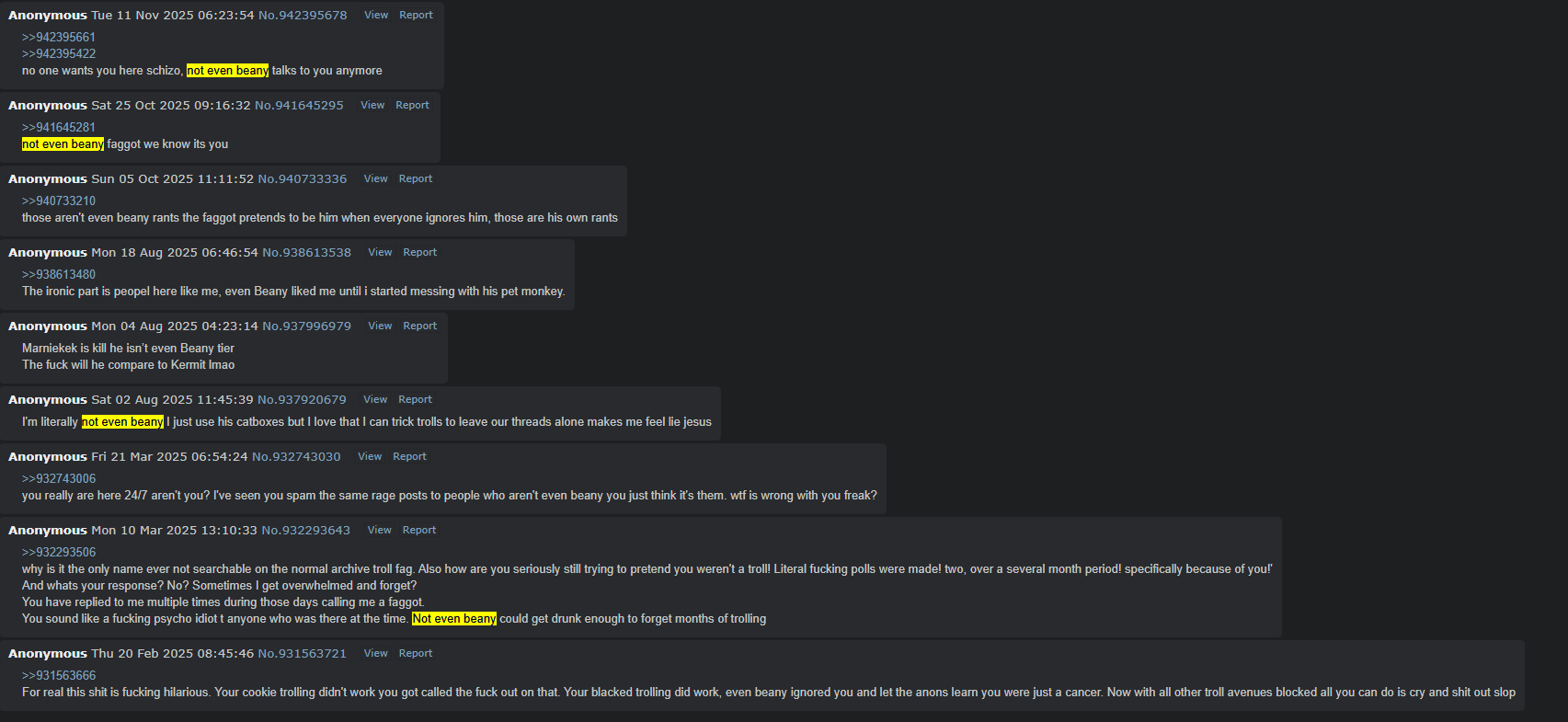>>945160760Im just a lurker but in the past week i have seen you assuming you are beany just get attacked by bot replies. Every post you mad had the exact same bot reply.