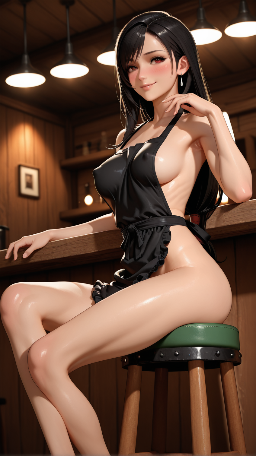 best quality, cinematic lighting, amazing quality, very aesthetic, absurdres, best quality, 1 girl, tifa lockhart, final fantasy, 1girl, red eyes, brown eyes, black hair, long hair, slender, skinny, medium breasts, (toned:0.7), naked apron, no panties, blush, indoors, pinup pose, sitting, hand on bar, hand up, 3D, covered nipples, , wide shot, seductive smile, depth of field, brown wall, green stool, wooden bar, Ceiling light, armpit,
