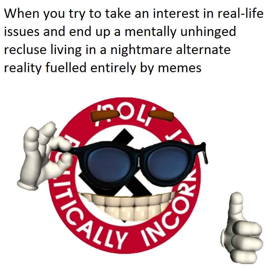 >jews buying up companies and making it illegal for you to discuss their crimes>leftoids only caring about the feelings of dead brown people instead of noticing all the other harm jews have done to the West, including mass-immigration>righties see mass-immigration as a problem but LOOOOOOOVE jews even when jews rape their kids, all because of muh bibbleEverything is so fucked up that it isn't recoverable. And you cannot wake people up either. They don't want to know.