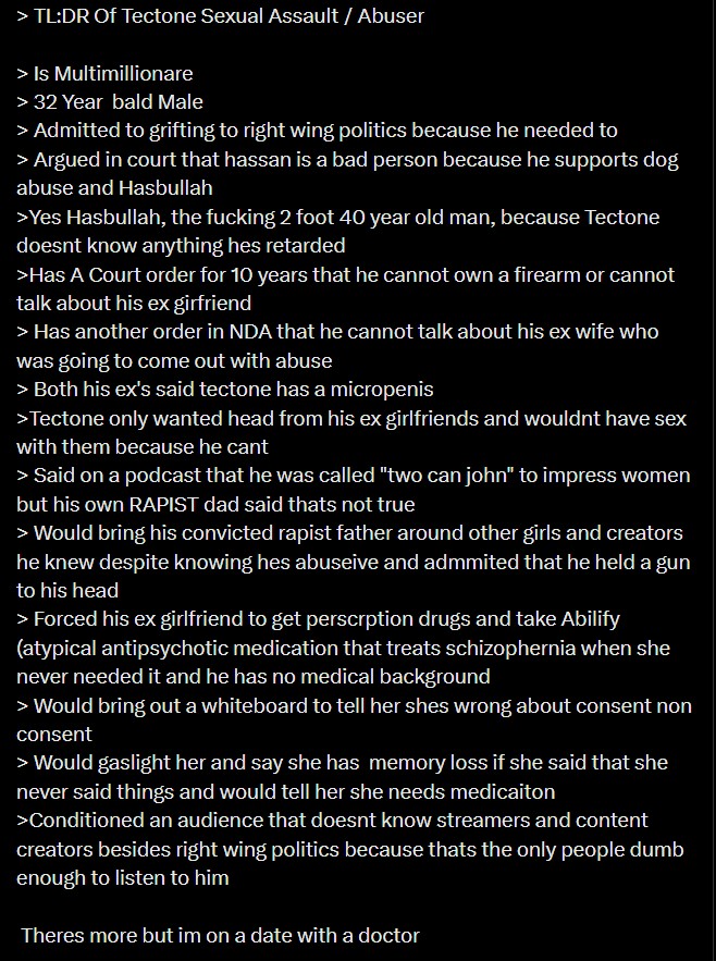 "he told me that instead of paying rent, I had to perform oral sex on him whenever I wanted. I felt like I had no other option but to comply"AHAHAHAHAHAHWho the fuck believes this shit bro, from a sexualized OnlyFans girl that wanted to get in deep with the Austin clout scene, and her ticket into the scene was Tectone.Because surely when a girl moves in with a clouted streamer guy, sex is not part of the total package
