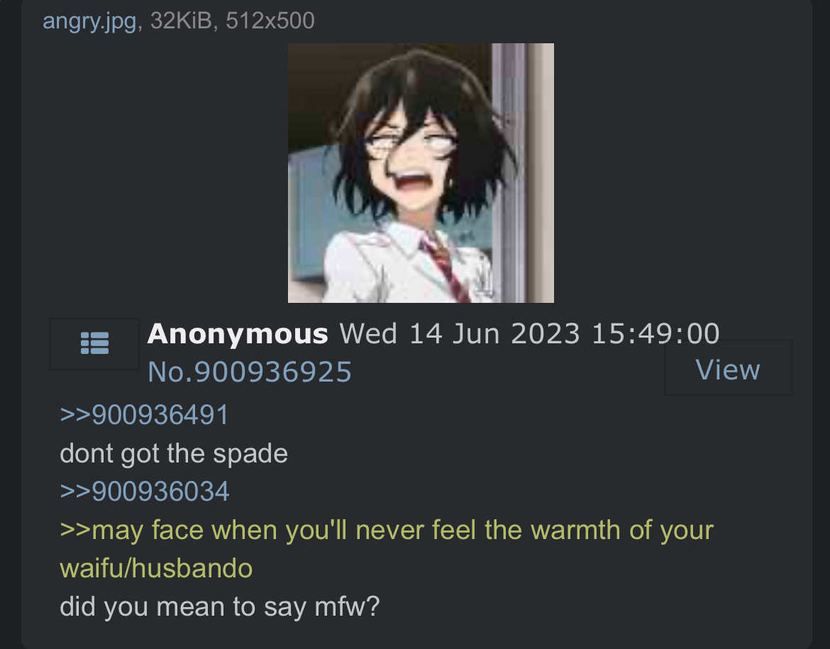 >>945334594Poor anon. You and I are not so different. Maybe if your wife was the ruler of our everyday lives, you would have the tiny amount of extra blessings that I have, and you would be playing persona right now.Or maybe that's just wishful thinking on my part. Sleep well, anonymous.>>945334444cool quads anon