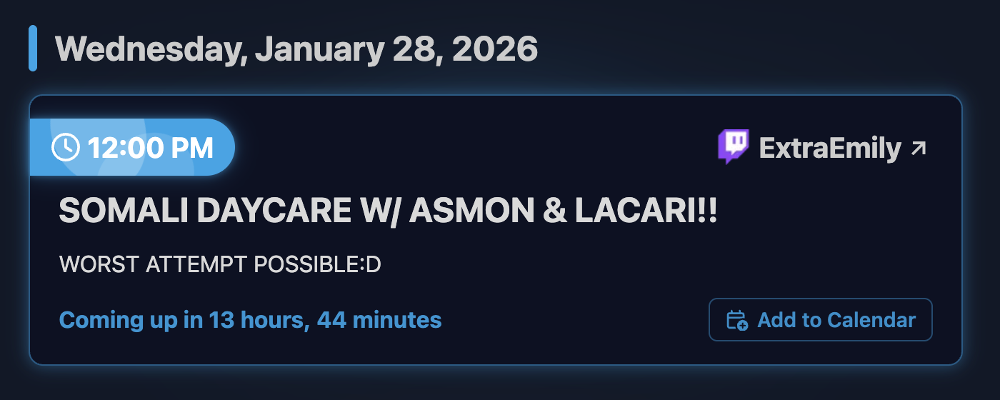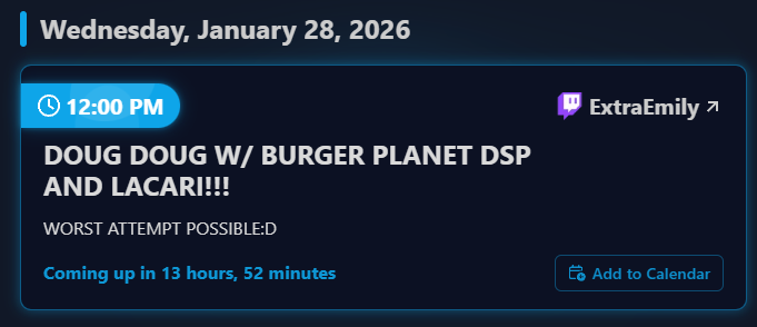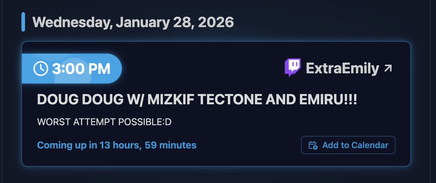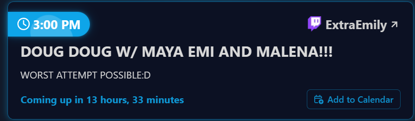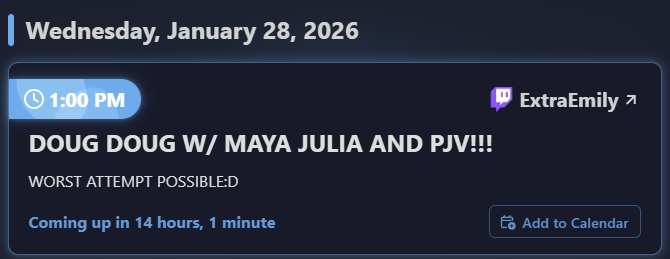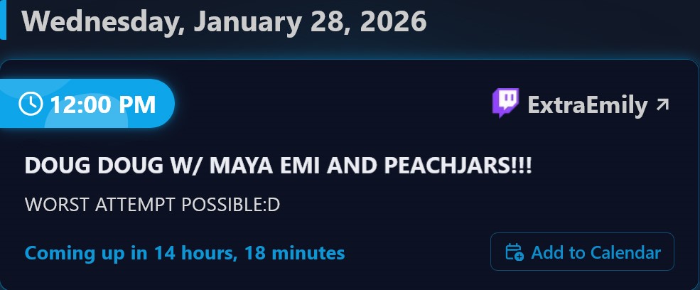 Emi isn't going to start early tomorrow. She'll show up around her usual time and say there isn't enough time to stream and doesn't want to do a short stream. She'll then be off for 2 days