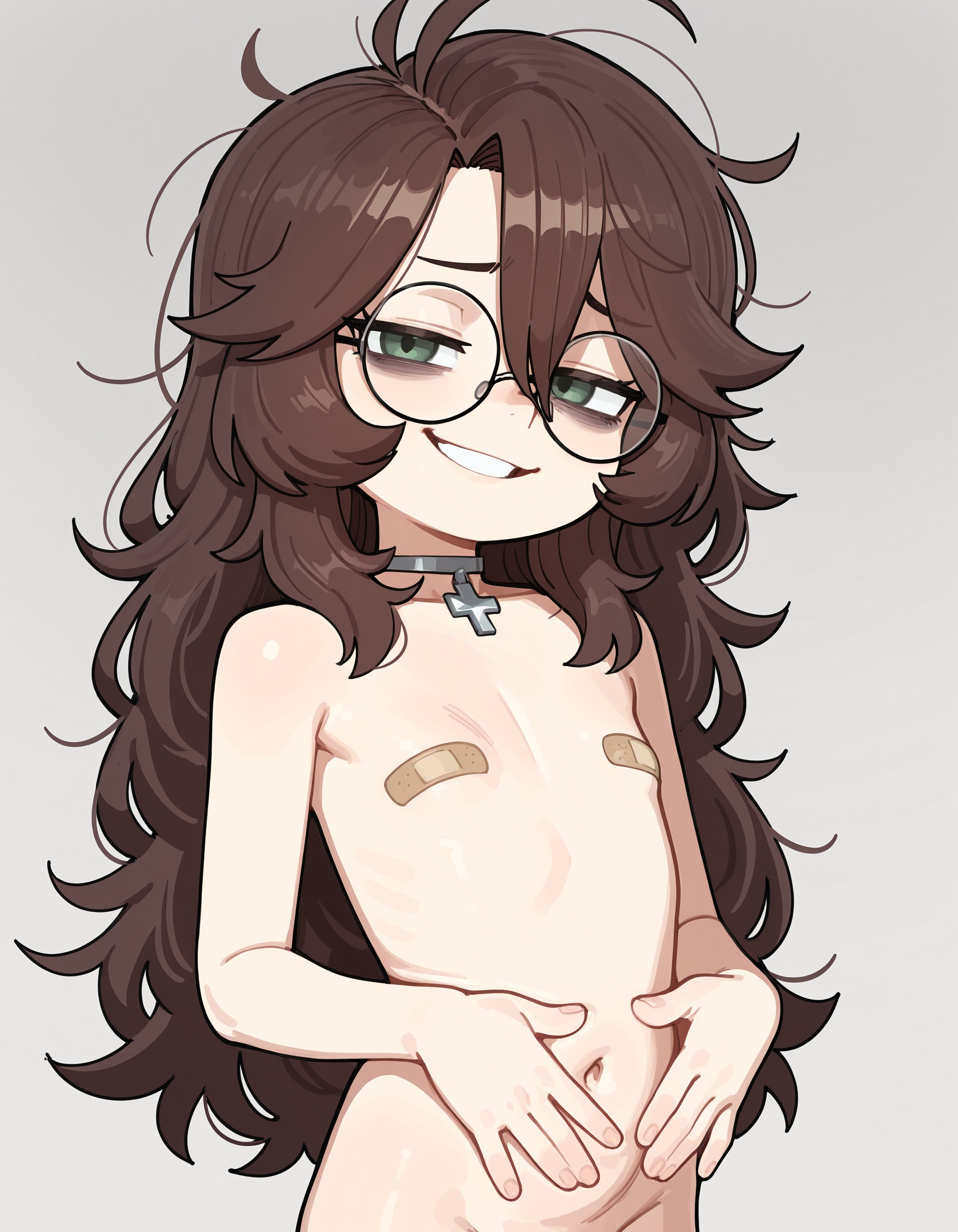 Requesting an anime style version of me as the Hulk with green skin, short black hair, brown eyes, and a muscular and chubby body, topless, wearing glasses, blue tight shorts with black and grey stripes, and black fingerless gloves, barefoot, standing in a full body shot, and with a warm friendly smile. Keep it SFW