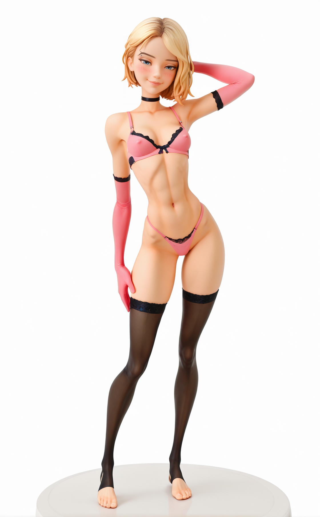 >>945432193Gwen Stacy lora and Anime Figure lora (toned:0.8), 1girl, , gwenstacy, blonde hair, blue eyes, bob cut, eyebrow piercing, slender, seductive smile, solo, skinny, small breasts, aroused, blush, contrapposto, legs apart,, feet apart, candid, f1gur3, , white background, simple background,, full body <lora:AnimeFigure_IXL:1>, 3d, , round base, dynamic pose, seductive, <lora:GwenStacyNoobXL_byKonan:1>, pantyhose, sneakers, miniskirt, pencil skirt, cropped shirt, long sleeves, striped shirt, navel, shirt, bracelet, ,spiked choker, black shirt, white shirt, oversized shirt, horizontal stripes, by aroma sensei