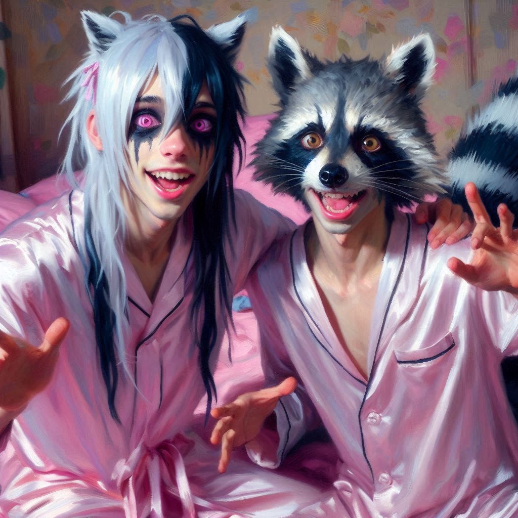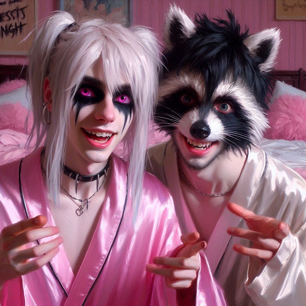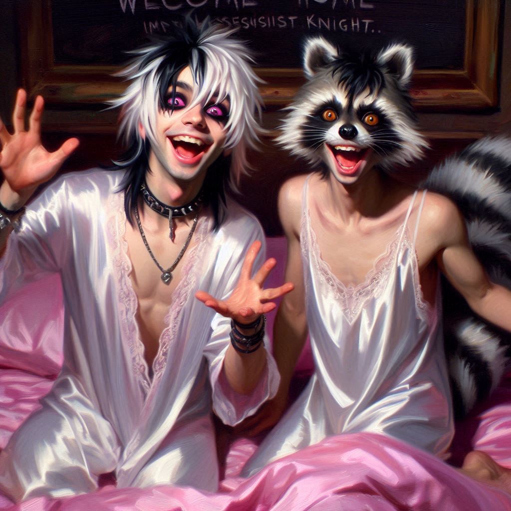 heavy brushstrokes, oil painting. 2 teenage boys, John(young Guy with black eyeliner,pink eyes,white long hair with black highlights,ponytail,black face makeup) and Racc(teenage human boy, baggy eyes, black hair, white hair tips, he has raccoon ears and tail).they're both wearing open silk nightgowns and making motions at viewer, giggling, artificial light, dim lighting, pink fluffy pillows, pink bed,