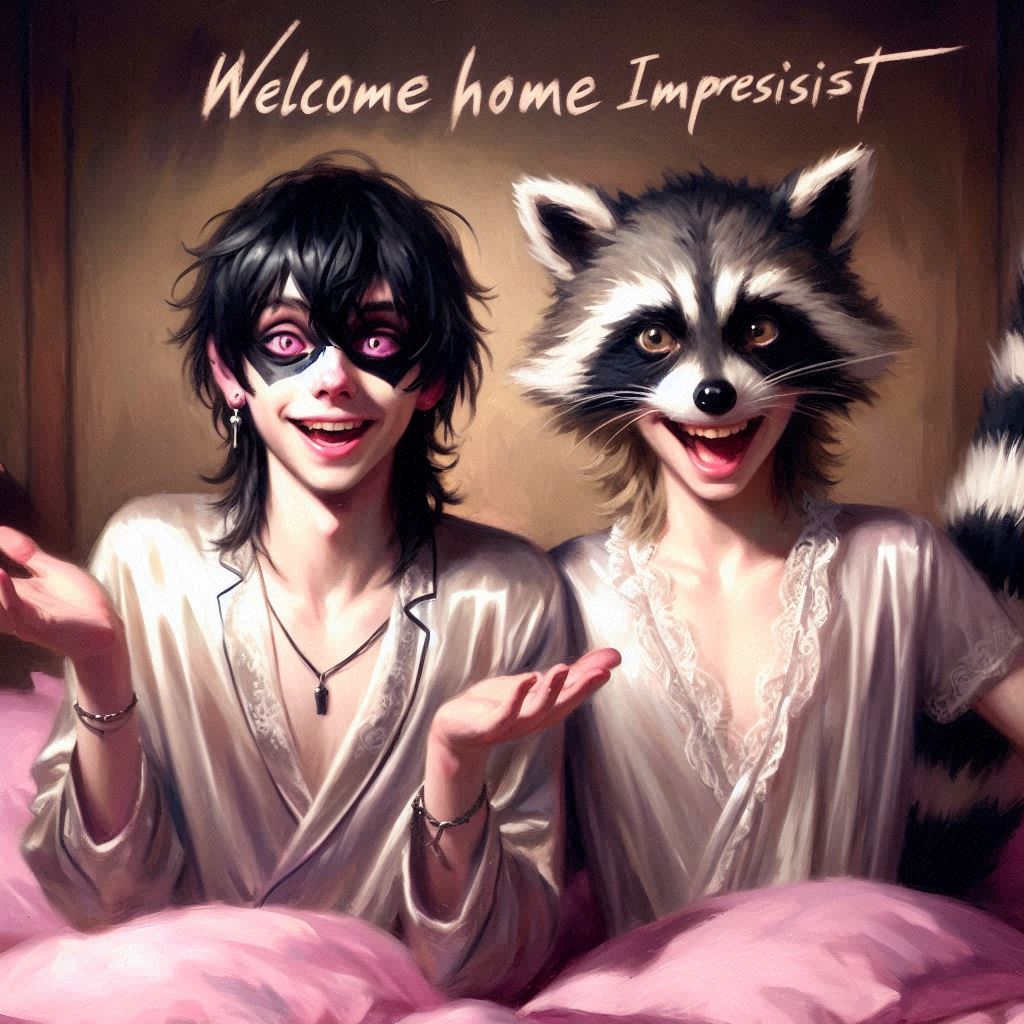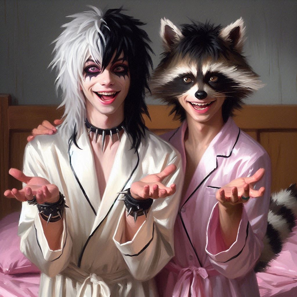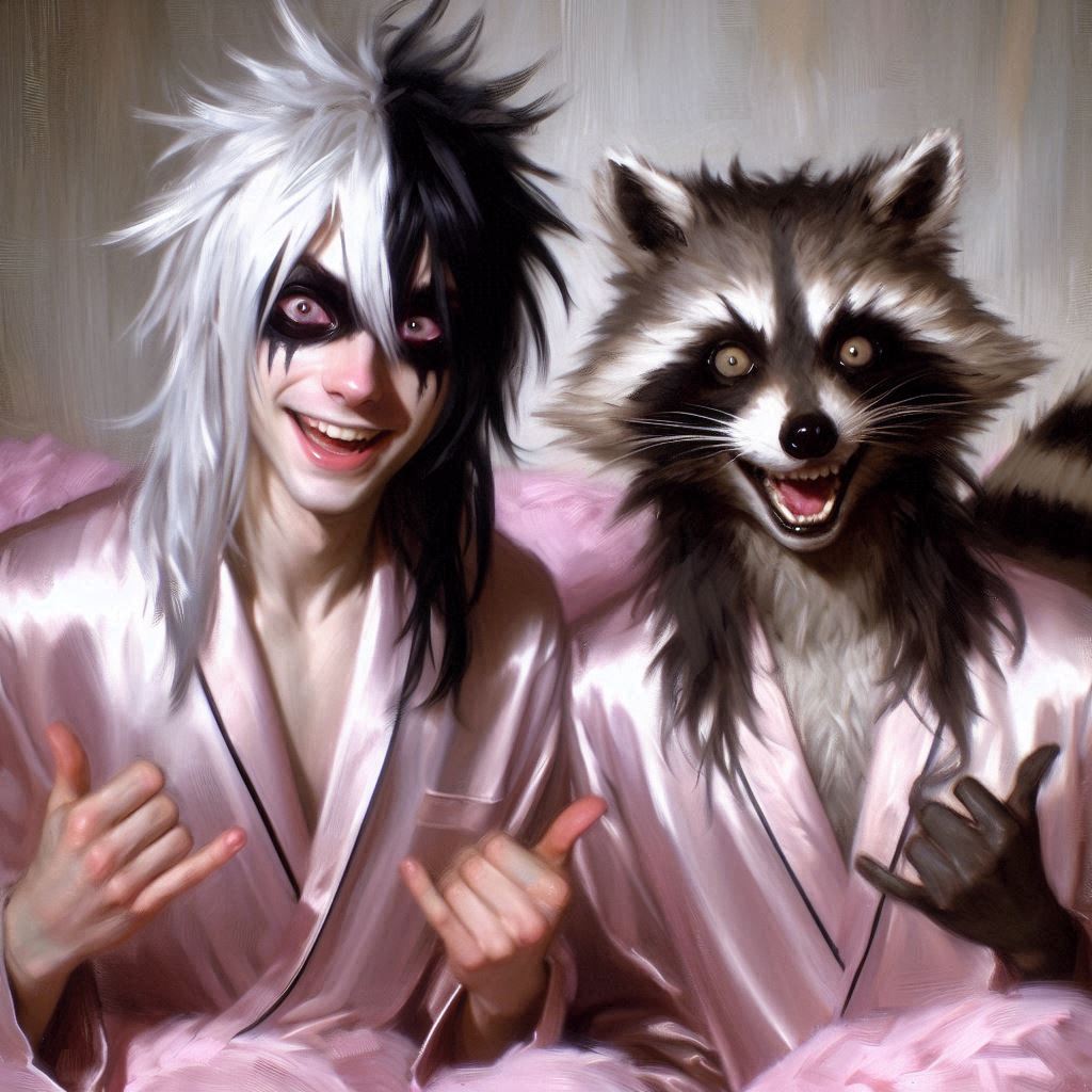 heavy brushstrokes, oil painting. 2 teenage boys, John(young Guy with black eyeliner,pink eyes,white long hair with black highlights,ponytail,black face makeup) and Racc(teenage human boy, baggy eyes, black hair, white hair tips, he has raccoon ears and tail).they're both wearing open silk nightgowns and making motions at viewer, giggling, artificial light, dim lighting, pink fluffy pillows, pink bed,