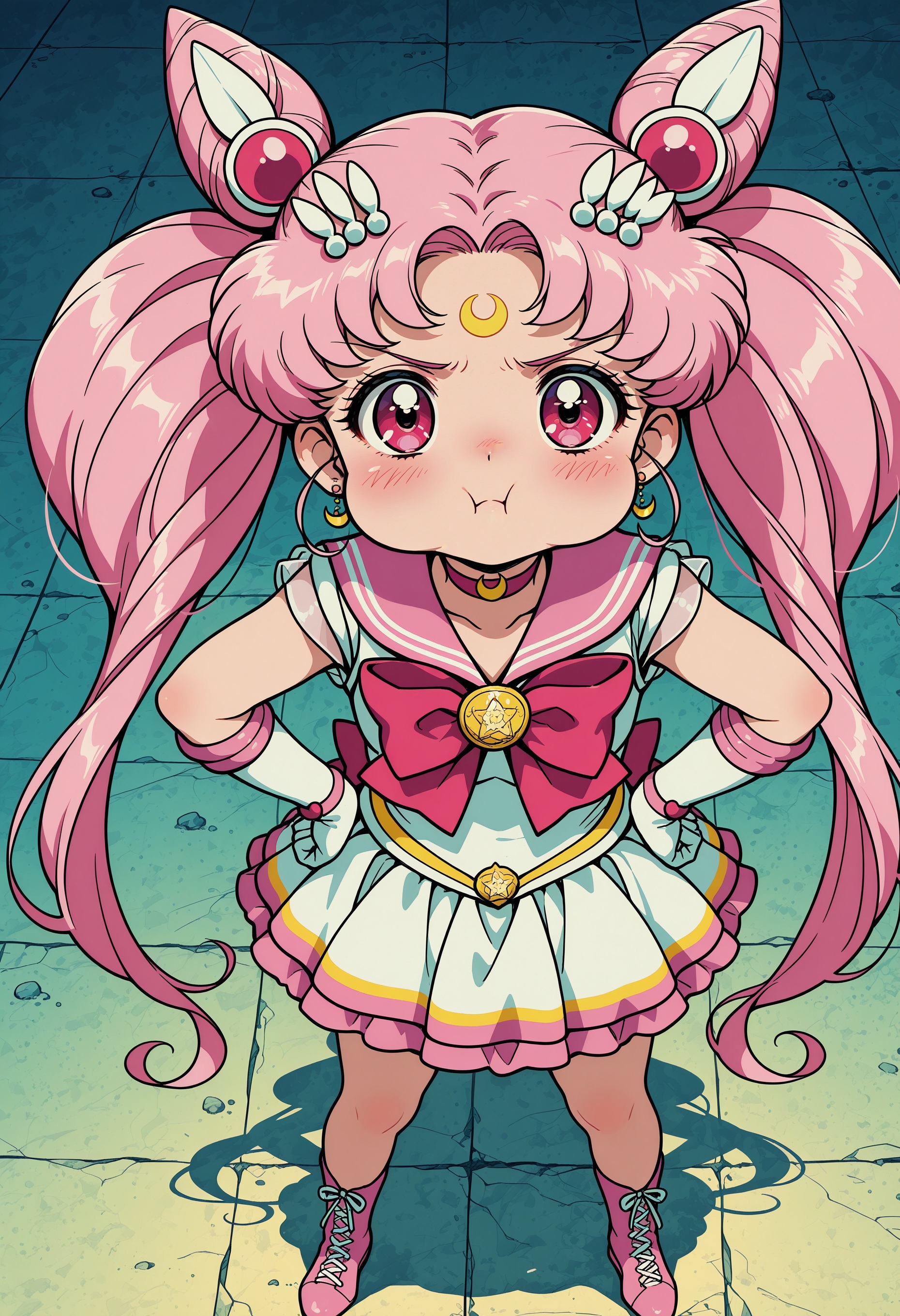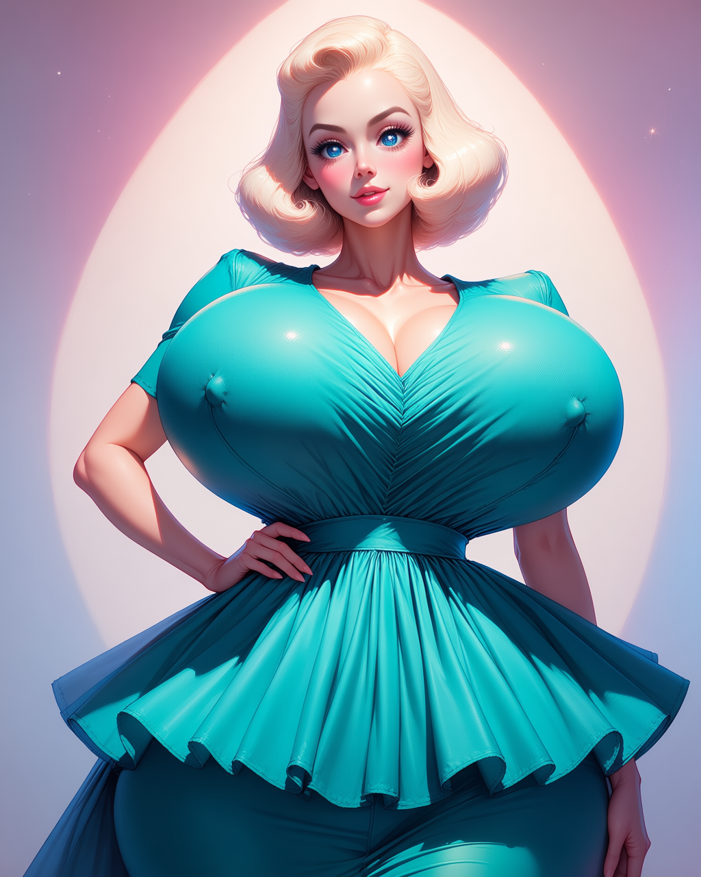 >>945550389Yikes! Here's the prompt I used to generate that one.score_9, score_8_up, score_7_up, source_anime,1girl, solo, beautiful anime face, huge sparkling blue eyes, long lashes, small heart-shaped face, glossy lips, short platinum blonde bob with soft waves,doll-like 1940s pinup beauty, impossibly slim hourglass figure, extremely narrow bony shoulders with subtle shoulder pads, razor-thin arms, visible collarbones, flat stomach, narrow hips, tiny butt, stick-thin legs,wearing a tailored late-1940s peplum dress, substantial teal gabardine or wool crepe fabric with slight sheen, sweetheart neckline or modest V-neck, fitted bodice with precise darting and sharp tailoring that dramatically accommodates and emphasizes absurdly massive, extremely large, perfectly round, sky-high breasts with extreme forward projection and bullet-bra conical shape, extreme upper pole fullness, sharp pointed silhouette, dress fabric stretched impossibly tight and smooth over the oversized, projected bust creating a clean structured retro look, dramatic peplum flare with ruffled or pleated detailing at the waist adding visual hip width, knee-length fitted skirt, full body, long spindly legs, sky-high stilettos, elegant three-quarter pose with hand on hip, soft vintage studio lighting, pastel background, vibrant colors, ultra-detailed, masterpiece, absurdres, 8k