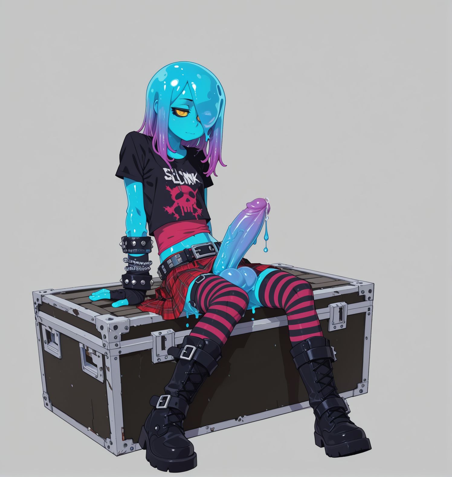 requesting Blueberry from Onirism in the punk rock outfit with him being given a blowjob by a human guy, also he's a candy person not a slime.