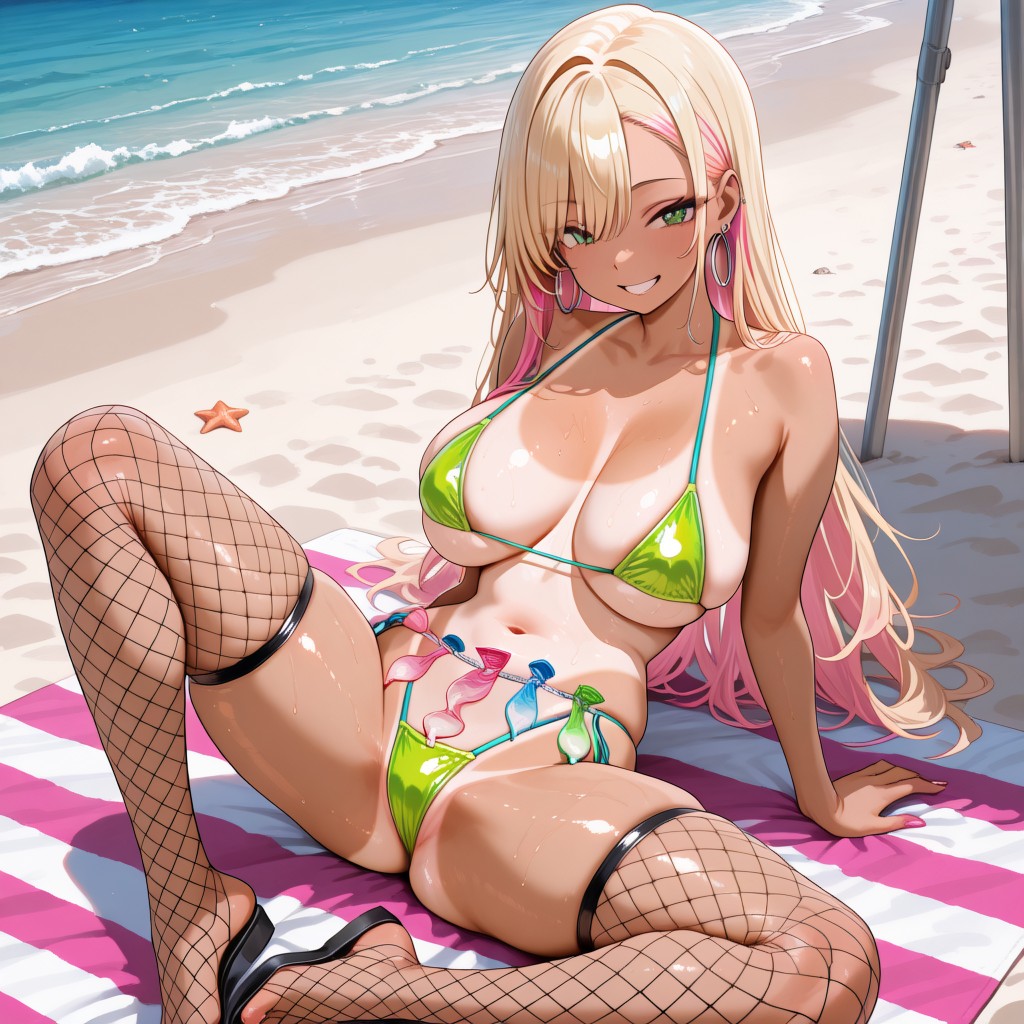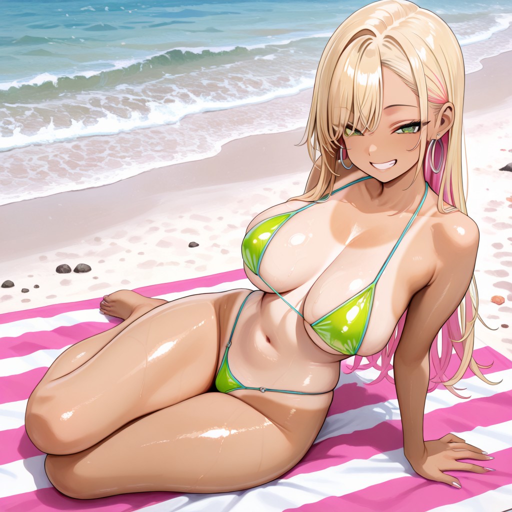 >>945657009The neon green of her bikini looks great with her tan lines.