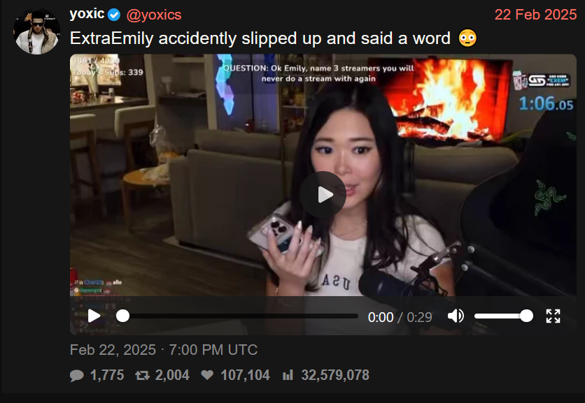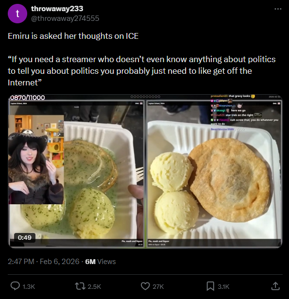 >>945697311emi mentioned earlier in the stream that her clips are popular in china along with asmon and hasan, and was like "oh no! me and the political streamer!"then, aly said:>So what are ur thoughts on ICE hasanette @Emiru ? SingsMici guess poking fun at her being the female hasan, so she should give her take on ICE. emi didn't realize it was a political comment until after she read it.