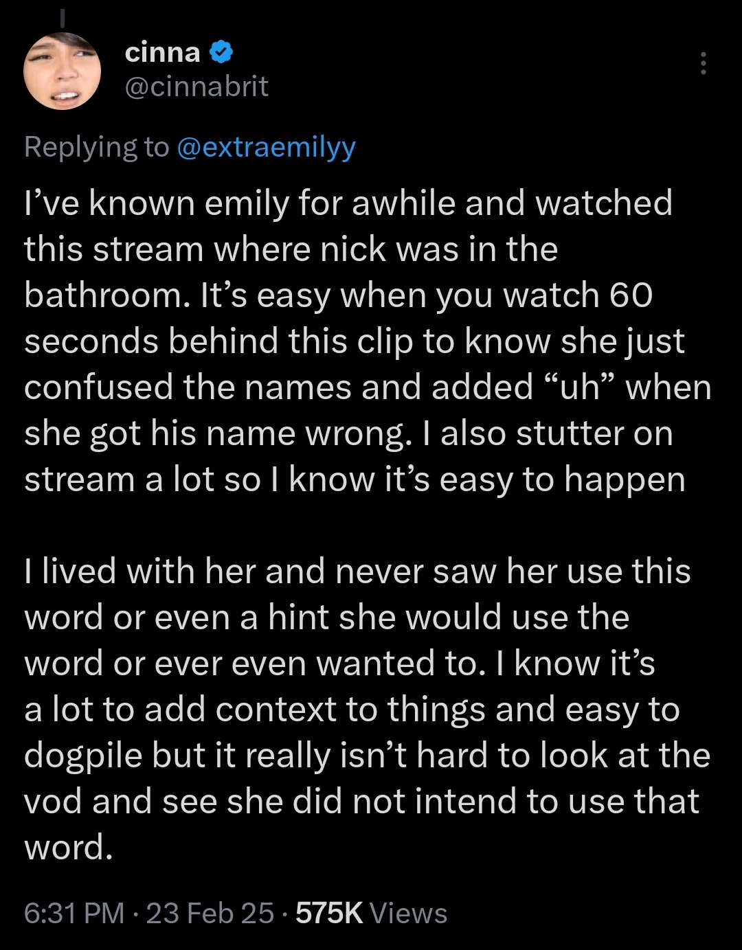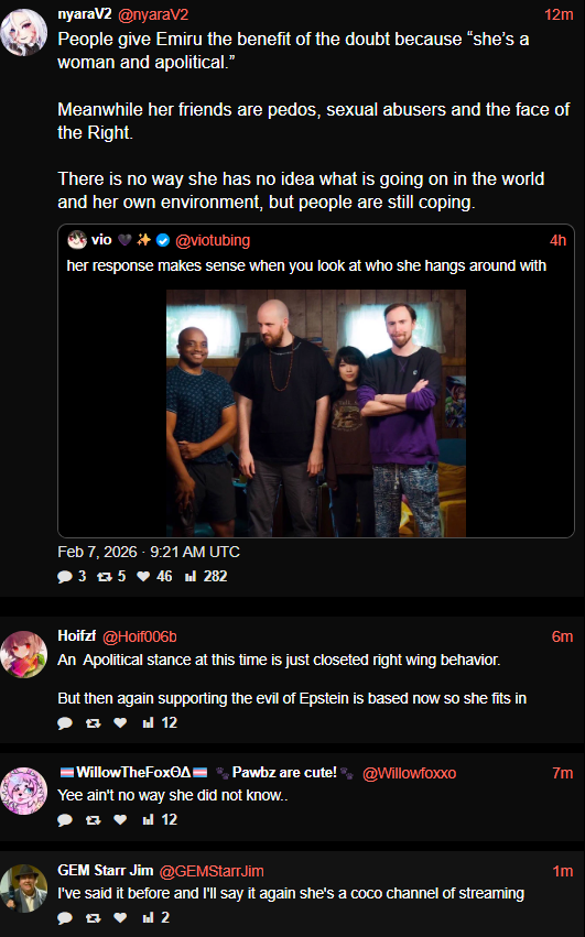 I'm so glad Emiru is getting cooked; she's such a fucking loser. Everyone supported her after she was assaulted at TwitchCon and demanded that changes be made to protect female streamers in the future, which was great & the right thing to do, but when it’s her close friends and collaborators who are committing sexual assault and calling for protestors to be murdered, she chooses to stay silent and do nothing to prevent it from happening again.