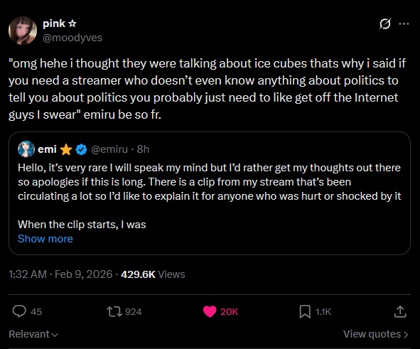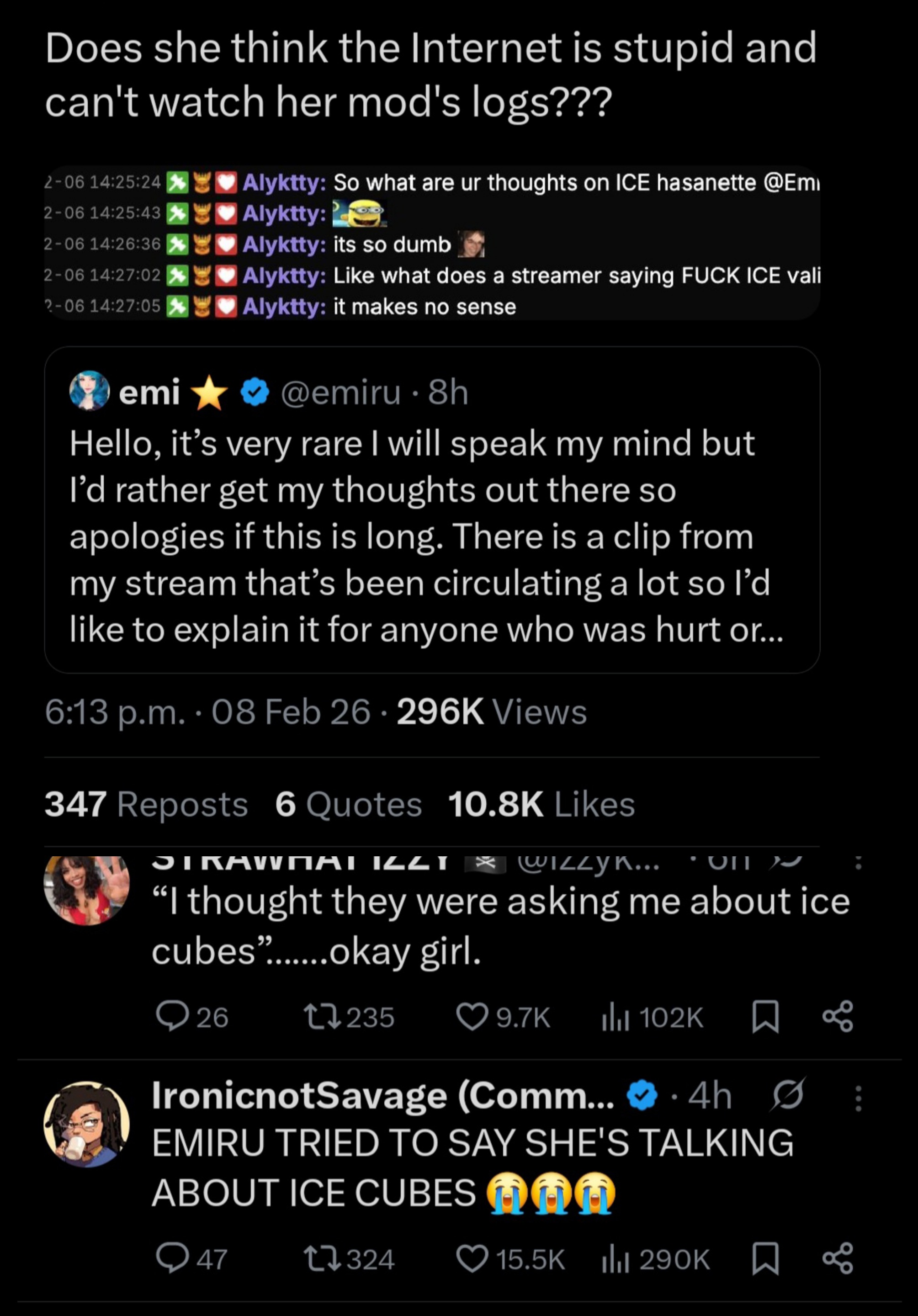 It was out of context.Emiru was talking about political streamersGets asked what her thoughts are on ICE by aly doesn't get it first then gets and moves on>Why do people want streamers opinions