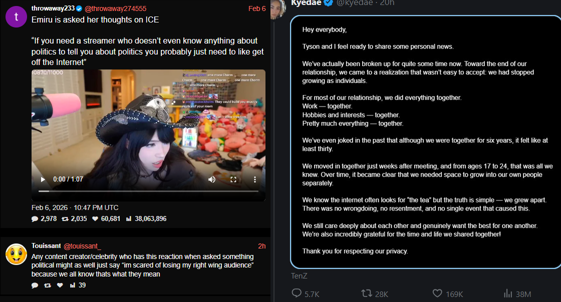 https://x.com/shaoirl/status/2020618693198110730?s=46&t=cW7WWviCZSrz8wFSn5wW0w> destiny: listen i hate women as much as the next guy, but a woman cannot be MADE famous by a guyMizkif and his incels btfo again. Neither xqc hasan or destiny actually believes in his train like incel takesI have to respect destiny. Miz prob thought he would stoop as low as to do denims/mikefrompa slander about emi, but what he didnt realize is that while destiny might be a dickhead and an asshole, he is not malicious and isnt going to whip up fake shit or nothingburgers. He wants to be real and authentic, smth he will never understand
