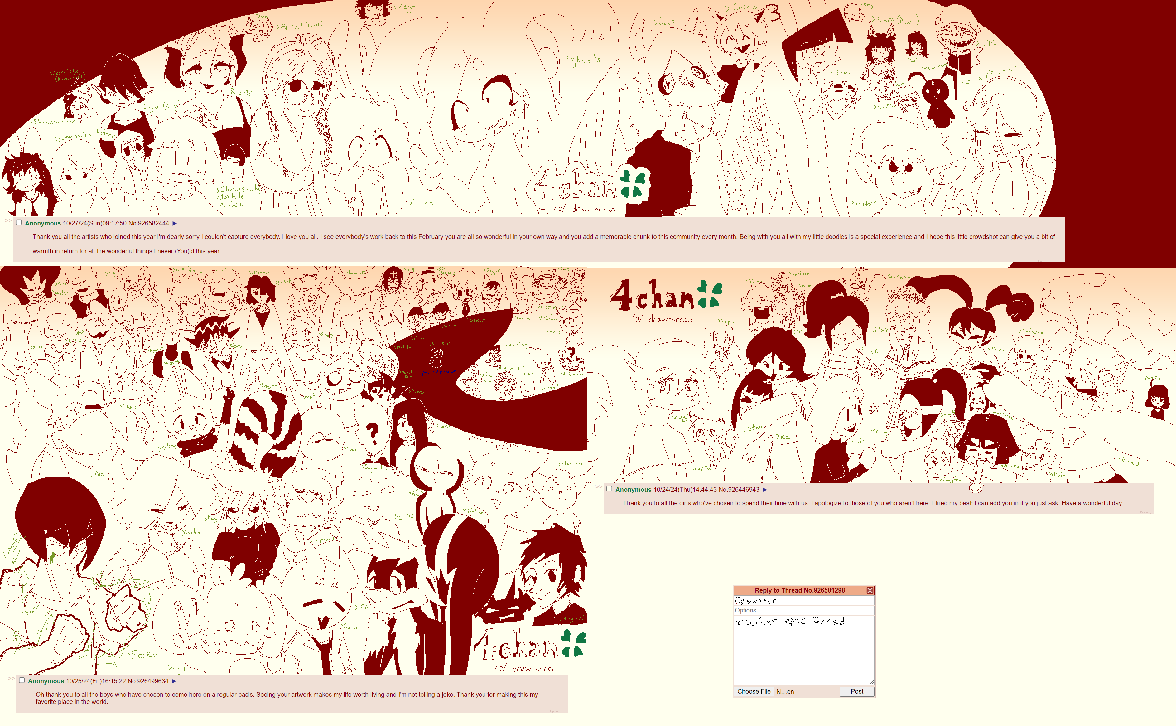 >>945855973I don't frequent these threads too often but I don't understand the appeal of them at allfrom what I can gather:barely anyone here draws. the ones that do barely say anything, don't do requests, and constantly run the risk of being doxxed. as far as I can tell drawfags come here solely to spite requesters and shitposters, which is largely a foolish endeavor, because their insistence on staying but remaining dormant is what fuels the other two groups.the requesters don't get any deliveries and only come here to fight with one another about shit that happens in drawthreads on other boards. they post their requests out of habit rather than an actual desire to have them drawn, and most of their requests at this point are made solely to spite other requesters.the shitposters seem to be the only ones even capable of enjoying their time here, but they rely on the drawfags and requesters to entertain them and fuel their shitpost addiction, and as of late, it's been getting stale for them. they've gotten to the point of creating their own OC and drawfag/avatarfag personas just to entertain themselves, and their shitposting has shifted from regular shitposting to "let's see how extreme can get before we get arrested irl".I can't help but wonder who is even making these threads anymore because none of these groups seem to have any reason to. everyone seems fed up with these threads, disillusioned with the community, and ready to watch everything come tumbling down.