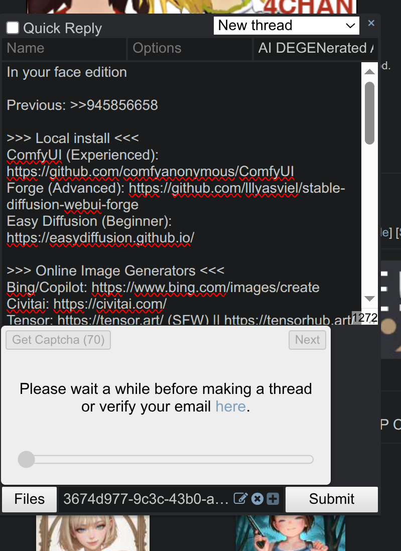 Lick editionOLD: >>945856658>>> Local install <<<ComfyUI (Experienced): https://github.com/comfyanonymous/ComfyUIForge (Advanced): https://github.com/lllyasviel/stable-diffusion-webui-forgeEasy Diffusion (Beginner): https://easydiffusion.github.io/>>> Online Image Generators <<<Bing/Copilot: https://www.bing.com/images/createCivitai: https://civitai.com/Tensor: https://tensor.art/ (SFW) || https://tensorhub.art/ (NSFW)Pixai: https://pixai.art/Grok: https://grok.com/imaginePerchance: https://perchance.org/generators>>> FAQ <<<Tags for Prompting: https://danbooru.donmai.us/wiki_pages/tag_groupsVisual tag reference: https://tagexplorer.github.io/Models/Embeddings/Characters/Prompts: https://civitai.comLoRa Training: https://github.com/derrian-distro/LoRA_Easy_Training_ScriptsSamplers: https://stable-diffusion-art.com/samplers/AMD GPU: https://rentry.co/sdg-link#amd-gpuLink Hub: https://rentry.co/sdg-linkOP Pasta: https://rentry.co/degenpastaArchive: https://thebarchive.com/b/search/subject/DEGENerated/Archive Alternative: https://archived.moe/b/search/subject/DEGENerated/>>> Related boards (their OP may have additional resources) <<<>>>/aco/sdg>>>/d/ddg>>>/e/edg>>>/g/sdg>>>/g/ldg>>>/h/hdg>>>/trash/sdg>>>/trash/slop>>>/u/udg>>>/vt/vtai>>>/vg/aids>>>/y/ydg