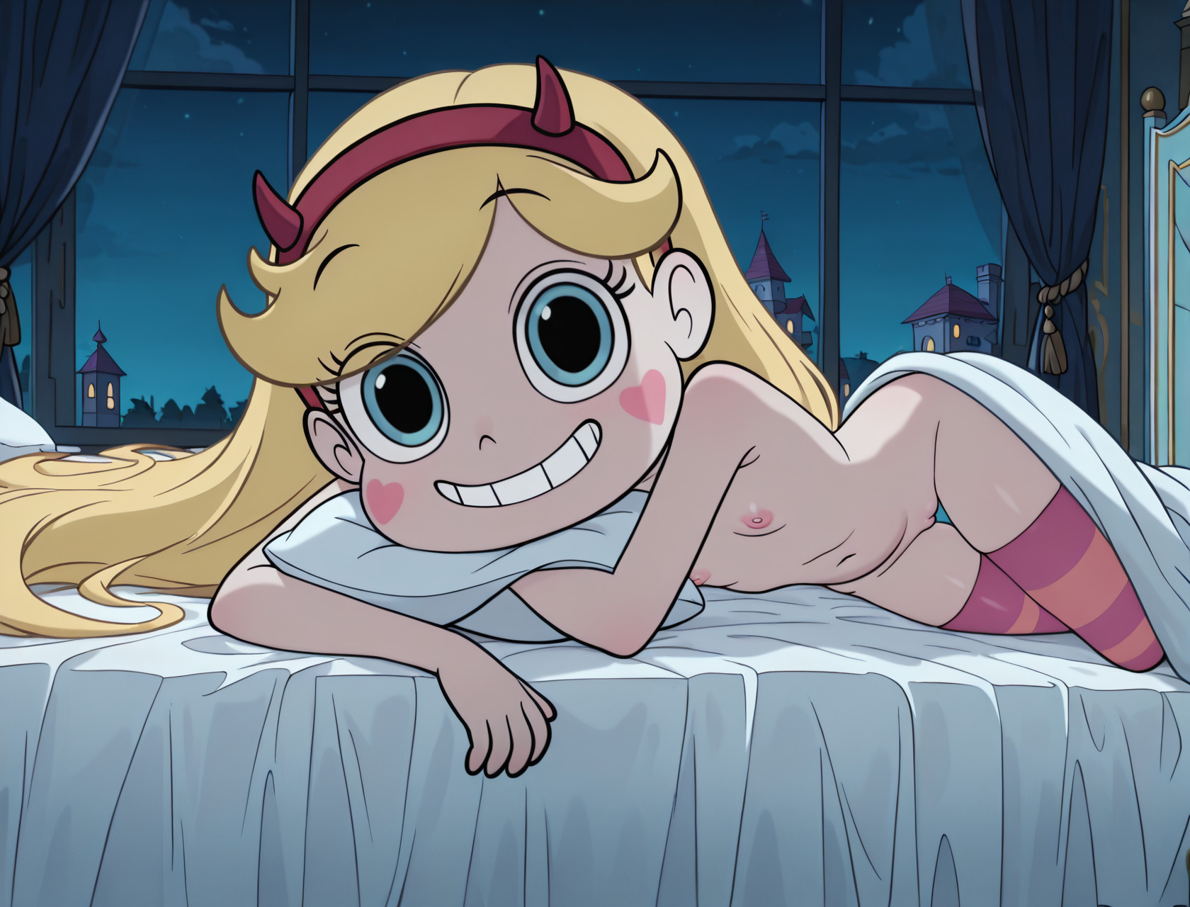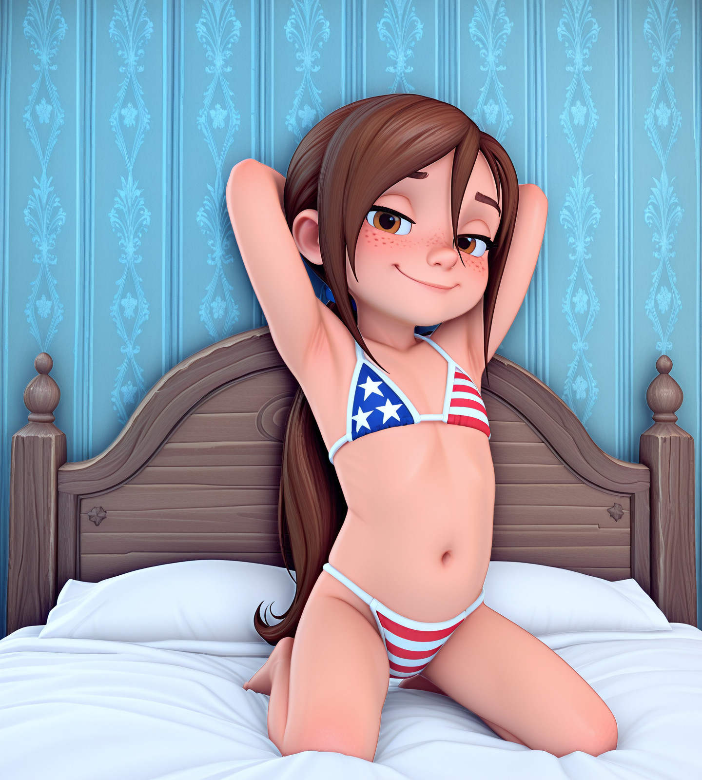 1 girl, wonder woman, dc comics, 1girl, lips, blue eyes, black hair, long hair, large breasts, medium breasts, tiara, nude, slender, on bed, white background, from above, seductive, blush, aroused, pussy, by joel jurion , looking at viewer, (toned:0.7), dynamic pose, sparse pubic hair,