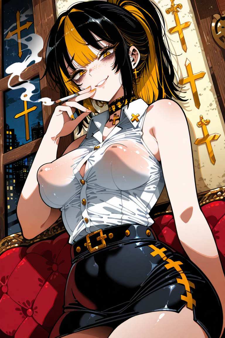 >>945872466Love that style. Is there a chance you could do her in a white sleeveless button-down, tight pencil skirt with inverted crosses pattern, velvet choker and a ponytail? Thanks in advance. :3