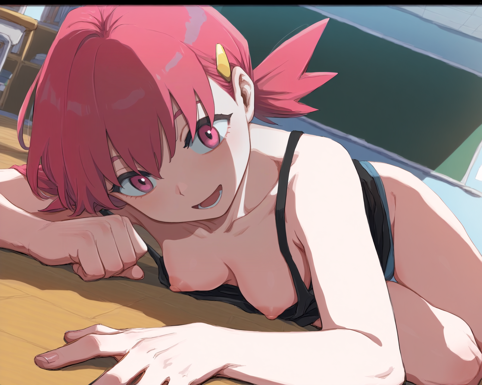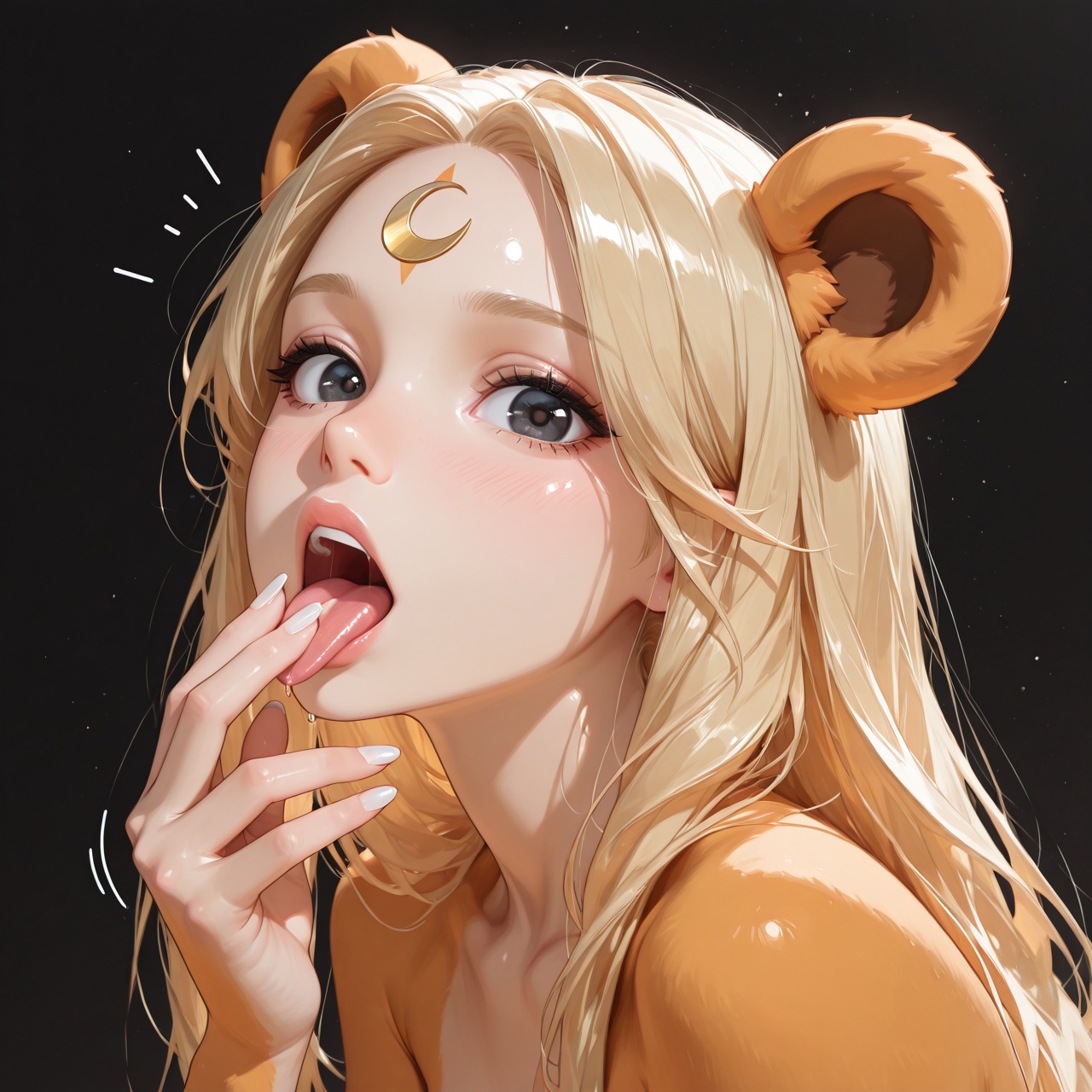 >>945877575>brown hair, blue eyes, dark skin, (((long wide nipples))), nude, large breasts, (perky breasts:1), (saggy breasts:1), very muscular, cute, slight smile, blushing, tongue out
