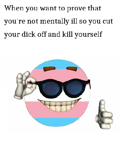 >>945902325I know you are trolling. I know that no matter what I say you will just be like>Haha you want to fuck trannysYou are completely predictable.I just hope I can nudge you closer to suicide. That is the only reason I reply.