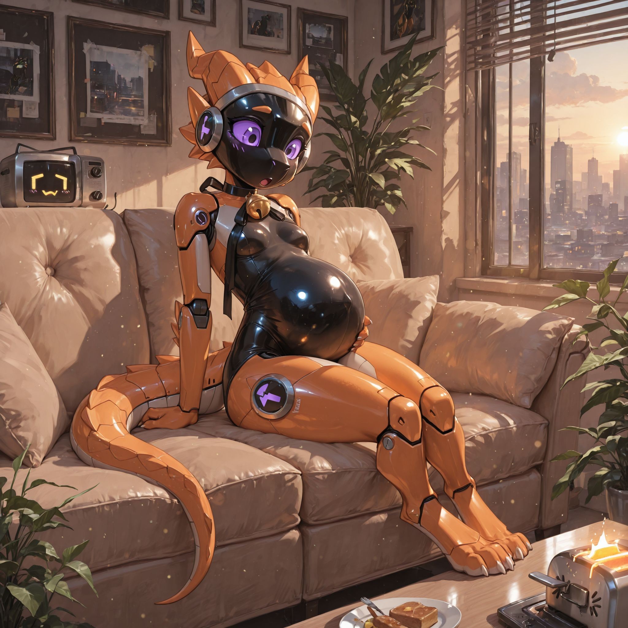 >>945891918loooll wanted to troll you with this one"sitting on couch, legs down, toaster on table, pregnant toaster, looking at toaster :O, tail down"and got this. she looks like she ate a baloon :D