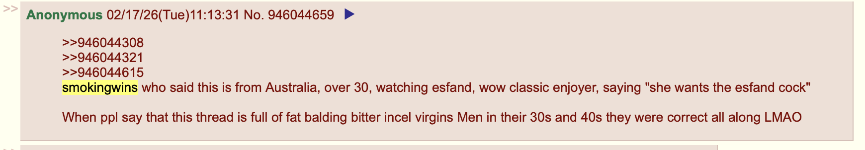 >>946049032>smokingwins is from Australia, over 30, fat, watching esfand, wow classic enjoyer, says "she wants the esfand cock" and goes to twitchgirls chats to insult them because he is a bitter lonely virgin incel waiting for the right moment to commit suicide KEKsmokingwins is truly the perfect representation of anons here. The hero this thread needed!Will you guys also commit suicide when smokingwins commits suicde?