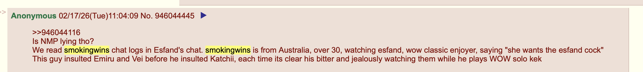 >>946048554>>946048632>>946048644Some guy called smokingwins called her voice annoyingsmokingwins also insulted Emiru and Vei. Sodapoppin insta banned him a month agoAnons here went through smokingwins Twitchlogs and we discovered that he is from Australia, over 30, fat, watching esfand, wow classic enjoyer, saying "she wants the esfand cock" and goes to twitchgirls chats to insult them because he is a bitter lonely vrigin incel playing wow classic solo KEKBasically smokingwins turned out to be smokingloses hahahaha