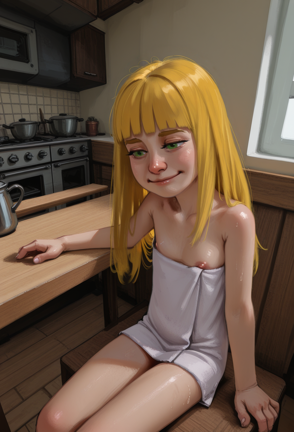 >>9462231911girl, little girl, straight bangs, long hair, yellow hair, green eyes, flat chest, naked, (tears:0.7), dynamic angle, bed, happy smile,on bed, looking at viewer, head tilt, portrait.1boy, size difference, penis, (sweat:0.7), messy hair, thrusting, motion lines, saliva, jerking off, cum, facial, handjob, imminent kiss, heart, wink, smug, holding phone, pink phone, looking at phone, selfie, outstretched arm