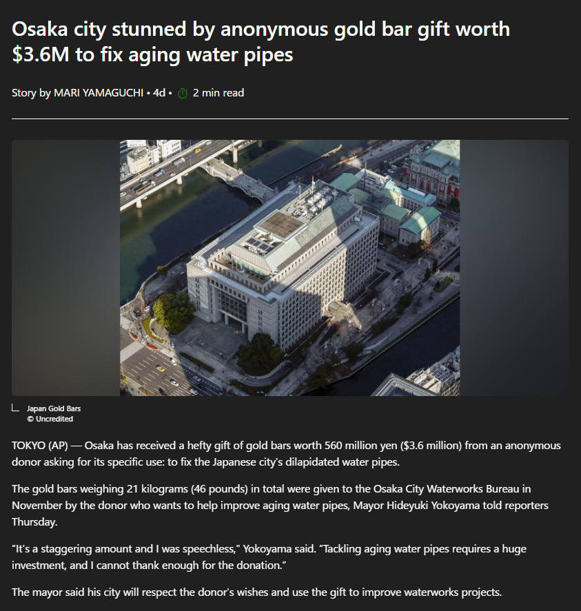 Meanwhile, around town at logposters house.....https://www.msn.com/en-us/news/world/osaka-city-stunned-by-anonymous-gold-bar-gift-worth-36m-to-fix-aging-water-pipes/ar-AA1WJ4GSTEE HEE